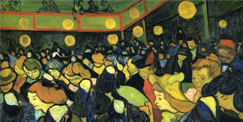 而《夜间咖啡馆》则有着巨大的压抑感。梵高将红色和绿色并置,以期达到画面的不和谐效果,桌球台像一具棺材那样醒目地横陈在中间,零落的几个人散置在周围,死气沉沉。梵高在信中曾谈到这幅画:“我在《夜间咖啡馆》里利用红色和绿色来表现人类的可怕情景,这些色彩不是呆板地按照现实主义的原则要求……而是一种富有暗示力的色彩运用……我试图表现出夜间咖啡馆是一个令人发疯、犯罪的场所;我通过柔和的粉红色、血红色、深红的酒色和一种甜蜜的绿色、委罗奈斯绿相对照来达到这一目的。这一切表现出一种火热的地狱气氛、惨白的苦痛、黑暗,压制着昏昏欲睡的人们。”