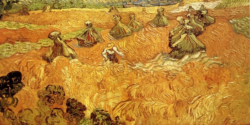 1889年11月,离辞别人世之前半年左右,即便在可怕疾病的阴影和折磨下,梵高如此致信弟弟提奥,谈及他当时一幅关于"麦田与收割者"的画作:我利用作画疲倦的间歇一点一点写这封信。工作进行得相当顺利——我在与画布搏斗,在我这次生病之前几天,我开始画一幅"收割者";这幅画整个是黄色调,颜料抹得是那么厚,但主题还是简练、单纯,令人愉快。那是一个轮廓模糊的人物,为了完成自己的任务,魔鬼般地战斗在麦田的热浪中间。我在这收割者身上看到了死神的形象,人是他所要收割的麦子。因而,这收割者(如果你愿意这样看)与我过去试图表达的播种者正好相反。只是,在这死神身上没有悲哀的味道,他在大白天干自己的工作,太阳用它纯金的光芒普照万物。在同一封信中梵高还写道:"瞧!《收割者》画完了,我想,你会把它留在自己家里。就其自然意义而言,'收割者'是一个死神的形象,但在我眼里,那'差不多是微笑'[梵高极为崇拜的德拉克洛瓦语]。……我发现这幅画很奇怪,我好像是透过单人牢房的铁窗看着它。"