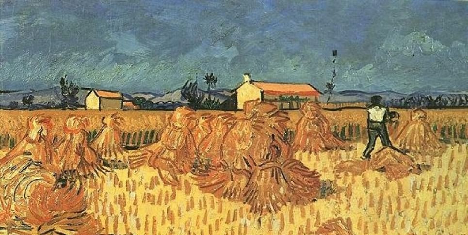 “……我在与画布搏斗,在我这次生病之前几天,我开始画一幅"收割者";这幅画整个是黄色调,颜料抹得是那么厚,但主题还是简练、单纯,令人愉快。那是一个轮廓模糊的人物,为了完成自己的任务,魔鬼般地战斗在麦田的热浪中间。我在这收割者身上看到了死神的形象,人是他所要收割的麦子。因而,这收割者(如果你愿意这样看)与我过去试图表达的播种者正好相反。只是,在这死神身上没有悲哀的味道,他在大白天干自己的工作,太阳用它纯金的光芒普照万物。……”