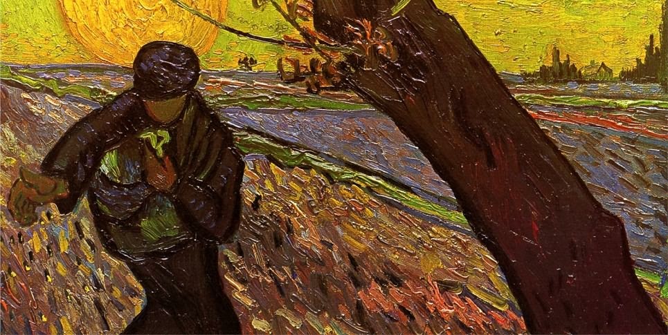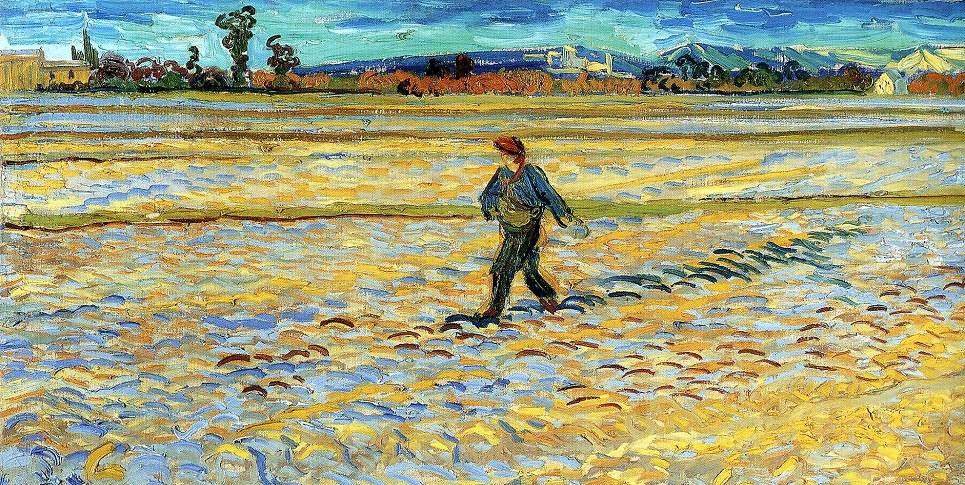 十多年后,梵高初次遭遇人生的挫折。几经折腾,他赴阿姆斯特丹准备神学院入学考试。其间有过这样一次经历:"星期天早晨我参加了劳里拉德牧师先生的布道会;他讲道:'耶稣在新播了种的麦田里行走。'他留给我极深的印象。在布道中他还讲到关于播种者的寓言,讲到'那人应该播种入土,应该日落而息,日出而作,麦种将破土而出,而他却不知其经过。'牧师还提到范·德·马丁那幅《穿过麦田的葬礼队伍》……"