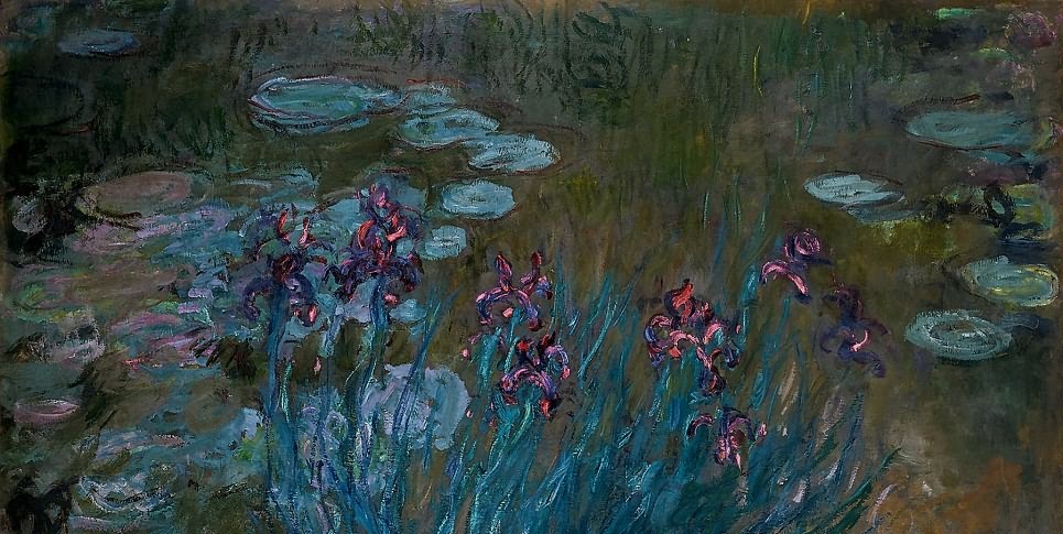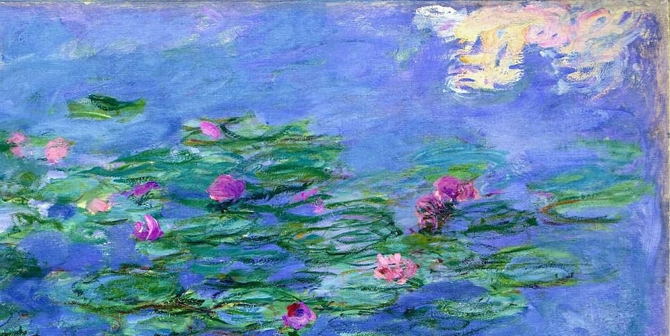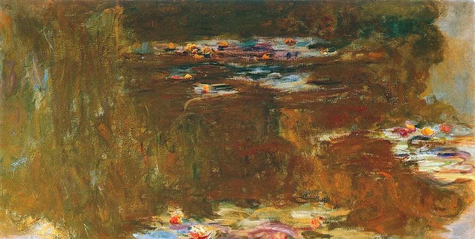其实,晚年的莫奈并不如它的睡莲池那样宁静安详,好友们、妻子和长子的相继去世令他饱受打击,也令他原有的眼疾加剧,发展成为白内障。患白内障的莫奈,就像耳聋的贝多芬,将自己置之死地而后生。在第一次世界大战期间,他请人修建了天花板透光的巨大画室,进行《睡莲》组画的创作。