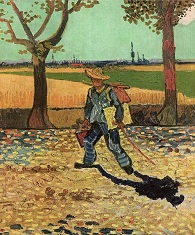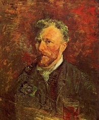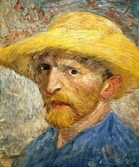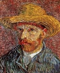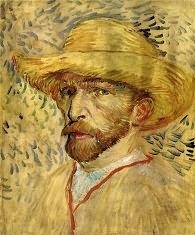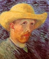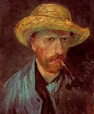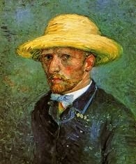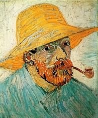 在这封信里,梵高接下来马上又做了与刚才的自我描述完全不同的另一种自我描绘:"然而此刻我的样子跟那幅自画像上已有差别,我既没留头发也没蓄胡须,胡须都剪掉和剃光了。另外,我的脸色也由粉红带淡青灰色变成了淡桔红色,我穿的是一件白衣服而不是蓝衣服,我总是满身灰尘,身上像箭猪一样竖着许多'刺'——画架、画布以及另外一些东西。只有绿色的眼睛没变,当然这幅肖像上还有一种颜色,即黄草帽,像季节工戴的那种,此外还有个很黑的小烟斗。"