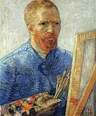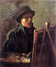 这幅自画像虽然也采用了传统结构,却带有职业宣言似的色彩,因为它既突出了作者的阶级身份又突出了作品的画家身份。在这幅作品里,梵高将自己描绘为身穿无领短上衣的工人式的画匠,手拿画具站在画架前面。然而他的装束却令人不知到底是何种身份的打扮。那上衣看上去像是被称为画家工作装的那种外衣,可是实际上画家的工作装通常又不是这种式样。画家的工作装要更宽松、更潇洒些,无领的领口处用饰有花边的带子将领口扎住。而梵高这件上衣的肩缝和领口处的纽扣却暗示这是一种更厚实的衣服,或许是工作穿的种上衣。梵高后来偏把它说成是农民的短外套。然而这件衣服本身式样的模糊即暗示着它是多重身份的象征——画家、手工艺人、工人、农民,恐怕梵高是想把所有这些身份都包含在其中吧。无论在作画时实际上穿的是什么样的服装,19世纪的画家们在自画像里是很少身穿工匠服的。他们的自画像常常更正规,许多画家画室里的形象都是穿衬衫或短外套的中产阶级,就像在弗尔南·科尔蒙的画室里那群画家一样;塞尚那幅自画像中画家本人就穿着坎肩和短外套。梵高在他这幅自画像中的无产阶级打扮也并非毫无依据。吕西安·毕沙罗和保罗·西尼亚克得在大街上遇见他时,他就穿着粘满颜料的衣服,像个整天跟颜料打交道的画匠。不过,这幅作品仍然算不上写真的作品。画面上除了画架并无其他背景,为这幅作品而穿的那件蓝外套上也没粘上什么。可见这件衣服是作者有意选择的,上面金色的斑点闪闪发光,似乎在赞美这件象征着职业的服装。