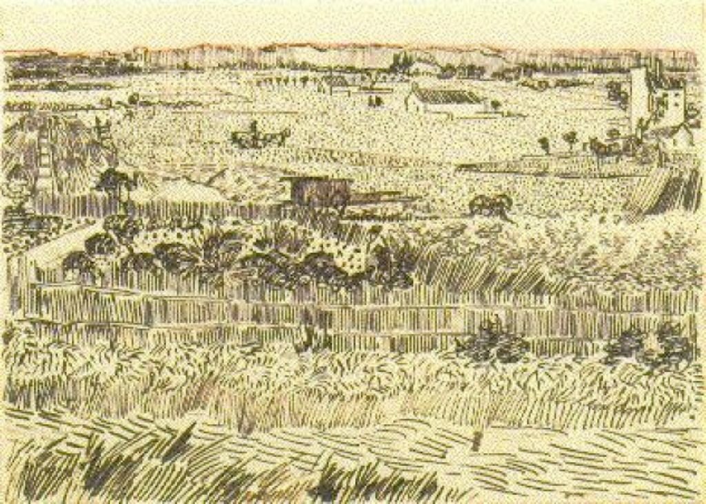 梵高于1888年2月离开巴黎来到阿尔勒,并很快爱上了这儿。猛烈的阳光和刺目的麦田使他 “疯狂”。创作进入了高峰。虽受法国印象派和日本浮世绘影响。但他的作品已极具个性,这源自其独特的视角和敏感的性格。他热爱大自然,热爱生命;他不满足于只是理性的 “模仿事物的外部形象”,而要借助绘画 “表达艺术家的主观见解和情感,使作品具有个性和独特的风格”。这幅画采用较传统的写实风格,整个画面笼罩在暖色调中。远景的处理,使得画面产生平远的效果。