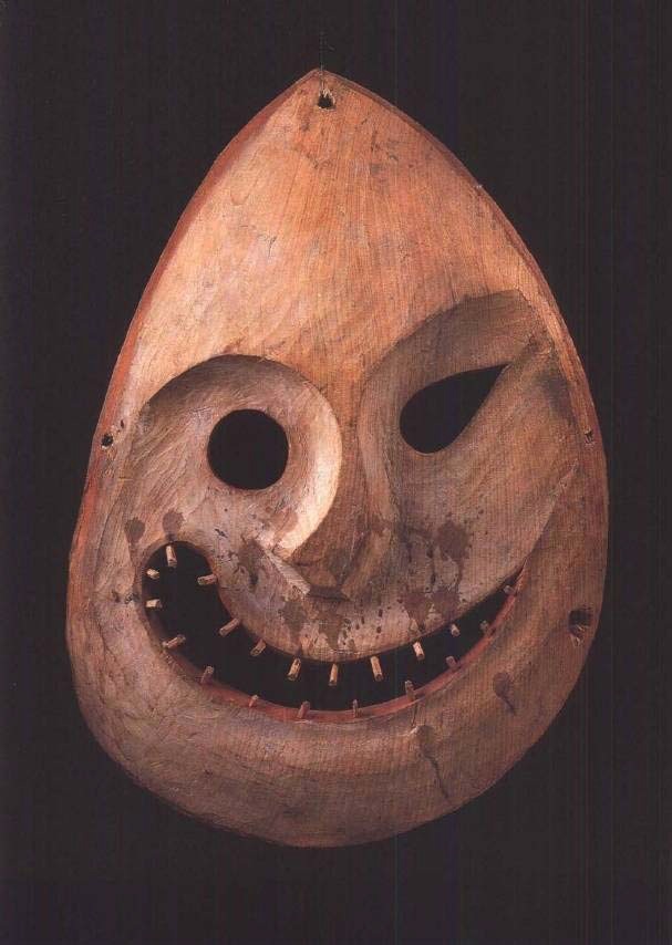 既然如此,究竟是什么原因使部落艺术品看起来那么生疏呢?我们又应该考虑自身和我们都能做到的实验了。我们拿一块纸或吸墨纸,在上面随便涂抹出一张脸来,画一个圆圈表示头,画一直道当鼻子,画一横道当嘴巴。然后看看这个没有眼睛的乱画之物,它是不是显得不胜悲伤呢?那可怜的家伙看不见东西呀。我们觉得非“给它眼睛”不可了——而当我们画了两个点,它终于能看我们时,又是多么大的宽慰呀!在我们看来,这一切纯属笑谈,但是在土人却并非如此。在木头柱子上刻出简单面孔以后,在他看来,柱子就完全变化了。他觉得木头柱子似乎已经变成了代表魔力的标志。一旦有眼看东西,也就没有必要再让它更像真人了。图24是波利尼西亚的“战神”像,名叫奥罗(Oro)。波利尼西亚人本来是杰出的雕刻手,可是他们显然觉得没有必要让它成为正确的人形。我们看见的一切不过是块缠着草编的木头,仅用草辫大略地表示出了眼睛和手臂。但是,一旦我们注意到它们,它们就足以使柱子显出具有神秘力量的样子。至此,我们还没有真正进入艺术领域,然而乱画之物的实验却可能给我们更多的教益,现在我们用各种可能的方式去改变我们涂抹出的面孔的形状。我们来改变眼睛的样子,从点改成十字或别的什么形状,叫它一点也不像真眼睛。我们把鼻子画成圆圈,把嘴画成涡卷形。只要它们的相对位置大致照旧就不会有什么影响。于是,对于土著艺术家来说,这一发现可能大有意义。因此这就教给他用自己最喜欢和最顺手的形状去构成人物或面孔。结果或许不大像实物,但它会保持一种图案(Pattern)的统一与和谐,我们最初的乱画之物就缺少这一点。图25是新几内亚的一个面具。这个面具可能并不好看,不过也不打算让它好看——它是准备用在仪式上,让村里的小伙子装扮成幽灵去吓唬女人和小孩的。然而,无论在我们看来这个“幽灵”是多么古怪或多么可憎,艺术家的手法总还是有叫人满意的地方,他是用几何图形组成了这幅面孔。