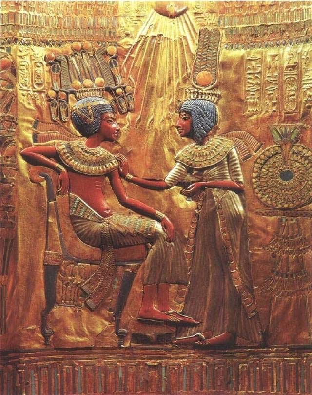 他叫人画的像新颖别致,在当时一定惊世骇众。画中完全摈除了其前的法老所表现的那种神圣、刻板的尊严气派。他叫人把他画成正在跟妻子妮菲尔提提(Nefertiti)在一起(图40),他们抱着孩子,沐浴在赐福的阳光之下。有一些肖像把他表现得很难看(图39)——大概他要艺术家画出他的全部人身缺陷;要不然,也许是他坚信他这个先知无比重要,所以坚持要逼真的肖像。阿克纳顿的继任者是图坦卡门(Tutankhamen),他的陵墓和宝藏是1922年发现的。其中有一些作品仍然是阿顿教的那种新风格——特别是国王宝座靠背上的像(图42),表现的是国王和王后的恬静的晏居生活。国王坐在椅子上,那种姿态可能已使严峻的埃及保守派愤愤然了——按照埃及人的眼光,简直是懒洋洋的。他的妻子把手温柔地放在他的肩膀上,个子丝毫不比他矮,而太阳神则表现成金球,正在伸手向他们赐福。
