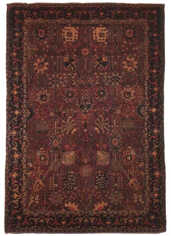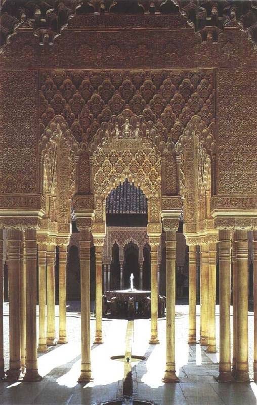 在返回西方世界、继续讲述欧洲美术的故事之前,我们至少要看一眼在那动荡混乱的几百年里,世界上其他地方出现了什么情况。图像问题是那么严重地纠缠着西方世界的心神,看看另外两大宗教对图像问题有什么反应就饶有趣味。在公元7世纪和8世纪时,势如破竹地克服了一切障碍的中东宗教,即波斯、美索不达米亚、埃及、北非和西班牙等地的伊斯兰征服者的宗教,对待图像问题比基督教的做法更为严厉。制像是犯禁的。但是艺术本身却不会这么容易就被压制下去。由于不准表现人物,东方的工匠就放纵想像去摆弄各种图案和各种形状。他们制作出最精细的花边装饰,人称阿拉伯式图案(arabesques)。我们走过阿尔汗布拉宫(Alhambra)的庭院和大厅(图90),欣赏那些千变万化的装饰图案,其感受之深令人难以忘怀。通过东方地毯(图91),甚至在伊斯兰领域以外的世界也熟悉了那些发明创造。我们可以把那些精细的设计和丰富的配色最终归功于穆罕默德,是他驱使艺术家的心灵离开现实世界的事物进入那线条和色彩的梦幻世界。后来从伊斯兰教中分化出来的宗派并不这样严格地理解对制像的禁令。只要跟宗教无关,他们是允许画人物和插图的。从14世纪开始的波斯人,后来还有伊斯兰教徒(莫卧儿)统治下的印度人,他们为传奇、历史和神话所画的插图表明,在那些国家中,以前的教规把艺术家限制于设计图案的天地之中,却使艺术家获得了那么大的益处。15世纪波斯传奇写本中有一幅花园的月夜景色(图92),就是那种妙技的最好例证。它看起来就像是一块地毯,在童话世界中画面竟奇妙地活了起来。它跟拜占庭艺术一样缺少现实感,或许更不现实。画中没有短缩法,也未尝设法显示明暗色调和人体结构。画中的人物和植物看起来仿佛像是从彩色纸上剪下,布置在书页上组成的一幅完美图案。然而正是由此,跟艺术家为了使人产生现实感而作出的图画相比,这张插图更为适合原书。我们看这样的画页几乎跟看正文一样。我们可以从两臂交叉站在右边角落的男主角,看到向他走去的女主角,我们可以驰骋我们的想像力,漫游这个月光下的神话花园,而丝毫不会觉得厌倦。