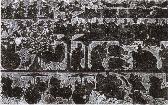 宗教对艺术的冲击在中国更为强烈。中国人很早就精通铸造青铜器的艺术,古代神庙中使用的青铜器有一些可以追溯到公元前1000年间,有些人说还要早。然而除此以外,我们对中国艺术的起源所知有限。关于中国绘画和雕塑的记载却不这么早。就在公元开始前后的几个世纪里,中国人的葬礼习俗跟埃及人多少有些相似,他们的墓室跟埃及墓室一样,有许多描绘生动的场面,反映出那些古老的年代里他们的生活和民俗(图93)。我们所谓的典型的中国艺术在那时已经获得很大的发展。中国艺术家不像埃及人那么喜欢有棱角的生硬形状,而是比较喜欢弯曲的弧线。要画飞跃的马时,似乎是把它用许多圆形组合起来。我们可以看到中国雕刻也是这样,都好像是在回环旋转,却又不失坚固和稳定的感觉(图94)。