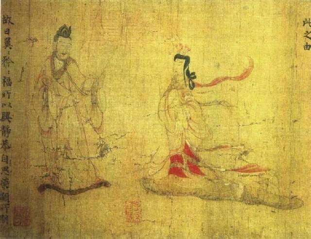 中国有些伟大的贤哲对于艺术的价值观似乎跟格列高利大教皇所坚持的看法相似。他们把艺术看成一种工具,可以提醒人们回忆过去黄金盛世的美德典范。现存最早的中国画卷有一卷是根据儒家思想选集的贞妇淑女;据说原本出自公元4世纪的画家顾恺之的手笔。这里选的插图(图95),画着一个丈夫无端地责怪妻子,它具有为我们所称道的中国艺术的全部高贵和优雅之处。画中的姿势和布置十分清楚,人们对一幅阐明事理的图画所可期待的能事已尽。此外,它也表明中国艺术家已经掌握了表现运动的复杂艺术。这幅中国早期作品中丝毫没有生硬之处,因为画中特别喜欢使用起伏的线条,这就赋予了整个画面一种运动感。