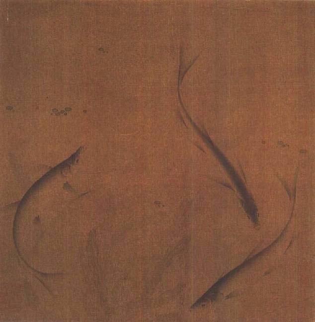 来学习艺术,这样,他们就不从研究大自然入手,而是从研究名家的作品入手,首先学会“怎样画松”,“怎样画石”,“怎样画云”。只是在全面掌握了这种技巧以后,他们才去游历和凝视自然之美,以便体会山水的意境。他们回家以后,就尝试重新体会那些情调,把他们的松树、山石和云彩的形象组织起来,很像一位诗人把他在散步时心中涌现的形象贯穿在一起。那些中国大师的抱负是掌握运笔用墨的功夫,使得自己能够趁着灵感的兴之所至,及时写下心目中盘旋的奇观。他们常常是在同一个绢本上写几行诗,画一幅画。所以,在画中寻求细节,然后再把它们跟现实世界进行比较的作法,在中国人看来是幼稚浅薄的。他们是要在画中找到流露出艺术家激情的印迹。我们可能难于欣赏那些最大胆的作品,例如图98,仅仅有一些朦朦胧胧的山峰形状从云中显露出来。但是,一旦我们尝试立足于画家的地位,体验一下他对那些巍峨的山峰想必已产生过的肃然心情,我们至少也能隐约感觉到中国人在艺术力方面最重视的是什么。把同样的技术和凝神的方法,如果用在较为熟悉的题材中,我们就比较容易欣赏了。一片池塘中三条游鱼的画(图99),使人体会到艺术家在研究他的简单题材时一定进行过细心的观察,体会到他在动手作画时处理手法的轻松和娴熟。我们再次看到中国艺术家是如何喜爱优美的曲线,如何使用它们来表现运动的效果。那些形状似乎并没有组成任何明显的对称图案,它们并不像波斯细密画那样平均分布。然而我们觉得艺术家还是满有把握地平衡了画面。这样一幅画可以久看不厌,我们大可体验一下。