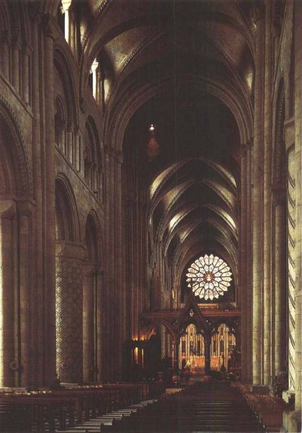 因此诺曼底的建筑师开始实验一种不同的方法。他们看到实际并不需要把整个屋顶都建造得那样沉重;只要用一些坚固的拱横跨那段距离,再用一些较轻的材料填充其间的空隙,也就足够了。他们还发现,要做到这一点,最好的方法是在柱子之间搭起一些交叉的拱或“肋”(rib),然后再把其间的三角形空隙填满。这个主意很快就改革了它的建筑方法,起源可以追溯到诺曼底式的达勒姆主教堂(Durham Cathedral)(图114);然而在威廉征服英国后不久,为这座教堂的巨大内部设计出第一个“肋式拱顶”(rib-vault)(图113)的建筑师,恐怕没有意识到它的技术发展前途。