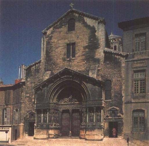在法国,罗马式风格的教堂开始用雕刻品装饰,不过“装饰”(decorate)在这里又是很容易引起误会的词,因为教堂里的一切东西都有明确的功用,都表达跟基督教的圣训有关的明确思想。12世纪晚期在法国南部阿尔勒(Arles)建造的圣特罗菲米(St Trophime)教堂的门廊就是这种风格最完整的实例之一(图115)。其外形使人想起罗马凯旋门(见119页,图74)的原理,在门楣上面的空间里——叫做檐饰内的弓形面(tympanum)(图116)——我们看到荣光环绕的基督,周围是四个福音书作者的象征物。狮子表示圣马可,天使表示圣马太,公牛表示圣路加,鹰表示圣约翰,这些象征都来自《圣经》。我们在《旧约》里读过以西结所见的幻境(《以西结书》,第一章,笫4-12节),他描写上帝的宝座由四个生物共擎,一个长着人头,一个长着狮子头,一个长着公牛头,一个长着鹰头。