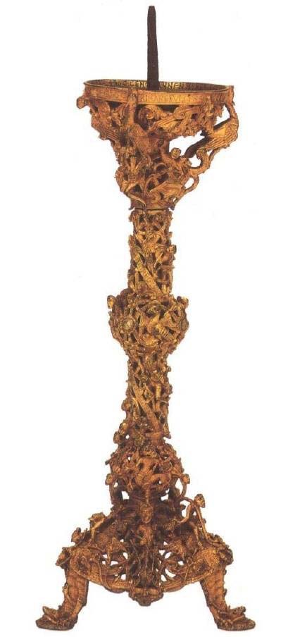 教堂内部的细微之处也都是这样精心设计,以便符合它的用途和教旨。图117是约在1110年为格洛斯特主教堂(Gloucester Cathedral)制作的烛台。蟠曲在一起构成烛台的怪物和龙使我们回想起黑暗时期的作品(见159页,图101;161页,图103),但是,现在已给予这些离奇的外形较为明确的意义。绕着它的顶部有一条拉丁文刻辞,大意是:“这个光明的承载者是美德的产物——它用光明来宣讲教义,使人们不被邪恶引入黑暗。”事实上一旦我们的眼睛看透这一团杂乱奇异的怪物,就不仅再次发现(在当中的球状突出物附近)代表教义的福音书作者的象征,还能发现一些裸体人物。那些人物像拉奥孔父子们一样(见110页,图69)也遭到蛇和怪物的袭击;但是他们却不是在绝望地挣扎。“闪耀在黑暗之中的光明”能够使他们成功地战胜邪恶的力量。
