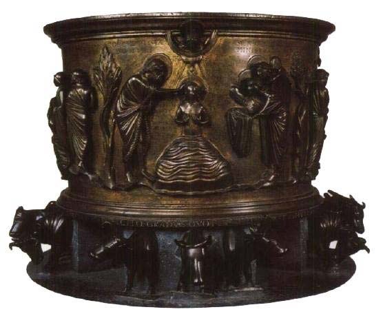 在列日城(Liege,在比利时)的一座教堂中有一个洗礼盘,大约制于1113年,这是神学家们参与向艺术家进言的又一个例证(图118)。它是黄铜制品,中部有一个基督接受洗礼的浮雕,这个题材用于洗礼盘最合适不过。上面有拉丁文刻辞说明了每个形象的意义:例如,从两个在约旦河(River Jordan)边等候迎接基督的人物上面,我们读到"Angelis ministrantes"(侍奉天使)一词。然而还不仅仅是由那些刻辞表现出每一个细部的重大意义而已,连那整个洗礼盘都带有这样的重大意义。甚至驮着洗礼盘的公牛形象也不是仅仅在那里装点或美化盘子。我们在《圣经》(《历代志下》,第四章)上看到所罗门王雇佣了一个灵巧的工匠,工匠来自腓尼基的蒂雷(Tyre),精于铸造黄铜制品。《圣经》描述了他为耶路撒冷的神庙制作的器物:又铸一个铜海,样式是圆的。径十肘……有十二只铜牛驮海。三只向北,三只向西,三只向南,三只向东。海在牛上,牛尾向内。列日的这位艺术家是又一位黄铜铸造家,在所罗门时代之后两千多年,要求他牢记于心的,正是那个神圣的样板。