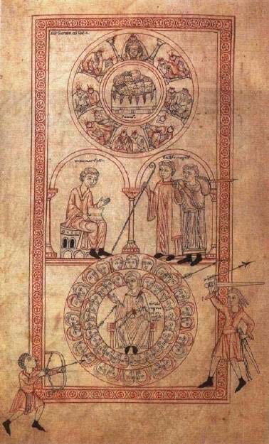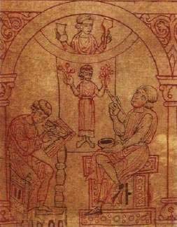 我们必须认识到,一旦艺术家最终彻底绝念于把事物表现成我们眼见的样子,他们的面前将会展现多么伟大的前景。图120是一所德国修道院使用的历书的一页,它标出10月份中要纪念的圣者的主要节日,但是跟我们的历书不同,既用文字,又用图解来说明。我们在画面当中的拱形下看到圣威廉马若斯(St Willimarus)神父和圣加尔(St Gall),加尔拿着主教牧杖,还带着一个随从,扛着这位漫游各地的传教士的行李。上边和下边的古怪图画是10月份应该纪念的两起遇难殉教的故事。此后艺术又重新转向对自然作巨细无遗的描绘时,这样残酷的场面往往要不厌其详地画出许多恐怖细节;而我们这位艺术家却能摒弃这一切。圣格伦(St Gereon)和他的随从的头被割下扔到井里,为了使我们想起他们,他安排丁一批被割掉头的躯干,很整齐地在图中绕井一周。根据传说,圣乌尔苏拉(St Ursula)和她的11,000名贞女遭到异教徒的大屠杀,我们看到她端坐在宝座上,被她的信徒团团围住。一个手执弓箭的丑陋的野蛮人和一个手挥长剑的男人,都放在框外,对着那位圣者。我们从这张画页就能直接了解那个故事,不是非在心里把故事形象化不可。而且,既然艺术家可以不用任何空间错觉,也不用任何戏剧性的动作,他就能使用纯粹装饰性的方法来安排人物和形状。绘画的确倾向于变成一种使用图画的书写形式;然而这种简化手法的恢复,却给了中世纪艺术家一种新的自由,去放手实验更复杂的构图(构图一词是composition,即放在一起之意)形式。没有那些方法,基督教的教义就绝不能转化成可以目睹的形状。