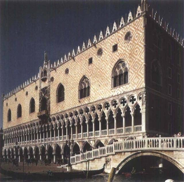 修建教堂不再是建筑家的主要任务了。在那些发展中的繁荣城市中,还必须设计许多非宗教性建筑,有市政大厅、行会大厅、学院、宫殿、桥梁和城门等等。那些建筑物之中,最著名、最有特色的一座就是威尼斯总督宫(Ducal Palace)(图138)。它动工于14世纪,正当威尼斯的强大和繁荣到达极点的时期。它表明,尽管哥特式风格后期的发展喜欢装饰和花饰窗格,但是仍然能够达到独特的壮丽效果。