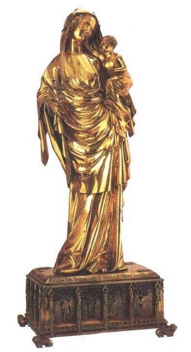 当时仍然给教堂大量地制作石雕作品,不过14世纪最有特色的雕刻恐怕不是石雕,而是用贵重金属或象牙制成的小型雕刻,那是当时的工匠所擅长的手艺。图139是一个法国金匠制作的小型银质镀金圣母像。这种作品不是供大众礼拜,而是摆在宫廷的礼拜堂中供个人祈祷。它们跟巨大的主教堂之中的雕像不同,不是打算用来庄严超然地指示一个真谛,而是激发人们的热爱和亲切的感情。这位巴黎金匠是把圣母看作一位真正的母亲,把基督看作真正的孩子,伸出手来摸母亲的脸。他小心翼翼地避免产生生硬之感。这就是他要使人物微带弯曲的原因——她的手臂放在自己髋部扶持着孩子,而头则歪向孩子。这样,整个身体略显倾斜地形成柔和的曲线,很像S形;那个时期的哥特式艺术家很喜爱这个母题。事实上,圣母的特殊姿势和跟她玩耍的孩子这个母题,可能都不是这位艺术家的发明创造。这种事情他是遵照当时的普遍风尚。他个人的贡献就在于精细地加工每一个细部,手的优美,婴儿手臂上的微细皱纹,镀金的银质和釉质的奇妙的表面,最后还有重要的一点是雕像的精确比例:玲珑小巧的头配在纤细修长的身体上。伟大的哥特式工匠制作的这些作品毫无粗率的地方。像覆盖右臂的有褶皱的衣饰,形成了优美而有韵律的线条,这种细部表现出艺术家是兢兢业业地组织作品。如果我们在博物馆里只是从他们旁边走过去,至多不过瞥上一眼,那就绝对不能给予它们公正的评价。它们制作出来是供真正的行家去鉴赏,是作为值得倾心的作品供人珍藏。