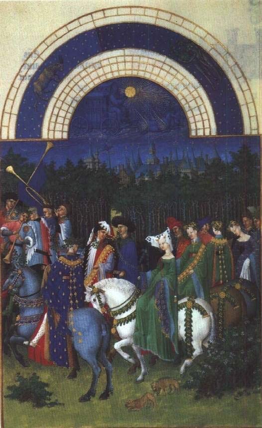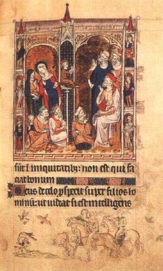 14世纪画家喜爱优雅、精巧的细节,这一点可以在一些著名的插图写本中看出来,例如英国的《诗篇》,即著名的《玛丽女王的诗篇》(Queen Mary's Psalter)。图140画的是基督在犹太圣殿,跟博学的文士谈话。文士让基督高坐在上;基督正在讲解教义的某个重点,他的姿势是中世纪艺术家用来画教师的典型姿势。犹太文士举着手,这是敬畏惊诧的样子。基督的双亲也是这样,他们刚刚走进现场,惊奇地相对而视。描述这个故事的手法是很不真实的。这位艺术家显然还不知道乔托已发现了一种方法,能够把一个场面表现得栩栩如生。《圣经》告诉我们,基督那时是12岁,跟那些成年人相比显得过于微小,而且艺术家也根本无意让我们了解人物之间的距离。进而我们还能够看出,所有脸面多多少少都是按照一个简单的程式画出来的,弯弯的眼眉,向下撅的嘴,还有卷曲的头发和胡子。更加令人吃惊的是看到同一页的下面部分,那里还添加了另一个场面,跟神圣的经文毫不相干。它的主题来自当时的日常生活,是放鹰捕捉鸭子。马上的男女和他们前面的孩子看到一只鹰刚刚抓到鸭子而兴高采烈,另外两只鸭子正在飞走。艺术家在画上部那个场面时,可能没有看一看现实中的12岁的男孩,可是他在画下部这个场面时无疑已经看过现实之中的鹰和鸭子。大概他对《圣经》的叙述太崇敬了,所以不能把他对实际生活的观察加进去,他喜欢把这两件事情分开:上面是清清楚楚地用象征的方式来叙述故事,使用容易理解的姿势,而且没有分散注意力的细节,但画在页边上的则是现实生活的一个片断,它让我们再次想起乔叟就生活在那样一个世纪里。正是在14世纪中,这种艺术中的两个要素,即优雅的叙述和真实的观察,才逐渐融合在一起。没有意大利艺术的影响,大概不会那么快就出现这种情况。