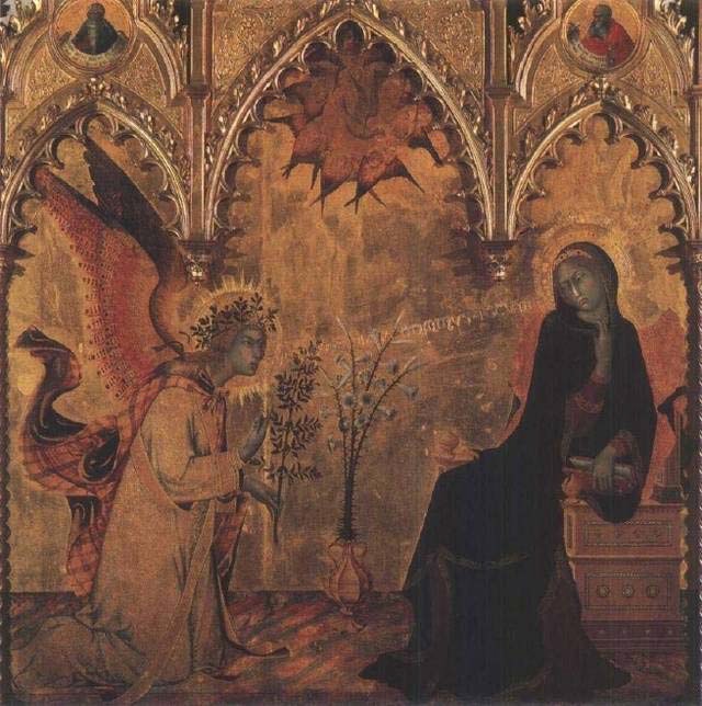 在意大利,特别是在佛罗伦萨,乔托的艺术已经改变了绘画的整个观念。古老的拜占庭方式突然显得生硬、陈旧。然而把意大利艺术想像为跟欧洲其余部分突然分离,那就错了。相反,乔托的观念,在阿尔卑新山以北的国家里赢得了影响,而北方的哥特式画家的理想也开始对南方的艺术名家产生了作用。特别是锡耶纳(Siena),它是托斯卡纳(Tuscan)的另一个城市,是佛罗伦萨的强大竞争对手,那些北方艺术家的趣味和风气给予那里深刻的印象。锡耶纳的画家不像佛罗伦萨的乔托那样,没有那么突然、那么彻底地跟以前的拜占庭传统决裂。跟乔托同时代的锡耶纳人之中最伟大的艺术家杜乔(Duccio,约1255/60-约1315/18)已经尝试过——并且连续不断地尝试——给古老的拜占庭的样式灌注新的生命,而不是把它们完全抛开。图141的祭坛嵌板是那一派的两个较为年轻的艺术名家所作,他们是西莫内·马丁尼(Simone Martini, 1285?-1344)和利波·梅米(Lippo Memmi, ?-1347?)。它表现出锡耶纳的艺术吸收了多少14世纪的理想和一般基调。这幅画表现圣母领报——是大天使加百利(Archangel Gabriel)从天国下来向圣母致意的瞬间,我们可以看到从他口中出来的词语是“Ave gratia plena”(万福,满被圣宠者)。他左手拿着象征和平的橄榄枝,右手抬起,仿佛就要讲话。圣母正在读书。天使的出现使她感到意外,她一面敬畏而谦逊地退缩回去,一面回头看着天上来的使者。在两人中间立着一个花瓶,插着象征着纯洁的白色百合花。在中间高处的尖顶拱形内,我们看到了象征圣灵的鸽子,四外围着长着四翼的小天使。这两位艺术名家跟制作图139和图140的法国和英国艺术家一样,都有喜欢精巧的样式和抒情的基调的嗜好。他们爱好飘动着的衣饰的柔和曲线与修长身躯的微妙优雅。事实上,整幅画看起来就像是金匠的一件珍贵的作品,形象从金色背景中突现出来,布局十分精巧,形成一个美好的图案。人们看到他们竟能把那些形象安排到形状复杂的嵌板中去,不能不惊叹不已;天使的双翼被装到左边尖顶拱形的边框之中,圣母的身形向后退缩到右边尖顶拱形的掩蔽之下,而他们中间的空白由花瓶和花瓶上面的鸽子填补。画家们已经从中世纪的传统之中学会了这种让形象适应某种图案的技艺。我们在前面也遇到过这种场合,赞美过中世纪艺术家把宗教故事中的象征之物安排成令人满意的布局。但是我们知道他们是忽视事物的真实形状和比例、完全不管空间距离才达到了那种效果。锡耶纳的艺术家已经不再使用那种方式。大概我们能够看出他们的形象有些奇怪,眼睛斜视,嘴部弯曲。但是我们只要观察几个细节,就能看出那些形象并非没有乔托的成就。那花瓶是个真实的花瓶,立在真实的石头地面上,我们能够准确地说出它立在天使和圣母身旁的什么地方。圣母所坐的是条真实的长凳,它越来越远向背景而去;她拿的书并不是代表一本书的象征之物,而是一本实实在在的祈祷书,光线洒在上面,书页之间有阴影,艺术家必定在他的画室里观察过一本祈祷书的样子。
