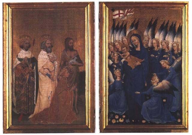 很容易看出威尔顿双连画的艺术跟我们前面讨论过的作品有什么联系,它像那些作品一样,也喜爱美丽、流动的线条和精致、纤巧的母题。圣母触及圣婴基督小脚的方式、天使的姿势和细长的手,都使我们回想起前面已经看过的形象。我们又一次看到艺术家是怎样显示出他的短缩法的技艺,例如跪在嵌板左边的那个天使的姿势;我们也看到他是怎样乐于使用写生画稿中的许多花朵,来装饰他想像中的乐园。