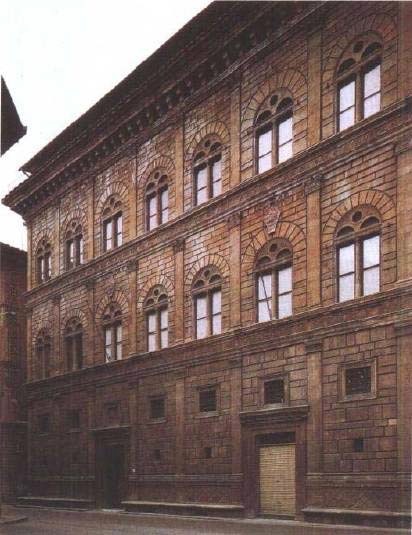 为了抓住要点据以综览那各种各样的艺术名家、“学校”和实验,我们最好返回佛罗伦萨,当时那里已经开始了伟大的艺术革命。观察一下在布鲁内莱斯基、多纳太罗和马萨乔身后的一代怎样试图使用他们的发现,怎样把那些发现运用于他们所面临的一切任务之中,这就足以令人神往。然而他们的尝试和运用并不容易实现。赞助人委托的主要工作跟前一个时期相比,毕竟没有本质上的改变;新颖、革命的手法有时似乎跟传统的差事相抵触。以建筑来说:过去布鲁内莱斯基的观念是使用古典建筑形式,使用他根据罗马遗迹仿制的柱子、三角额墙和檐口,他把这些形式用在自己建造的教堂之中。他的后继者渴望照样仿敬他的榜样。图162是佛罗伦萨建筑家利昂·巴蒂斯塔·阿尔贝蒂(Leon Battista Alberti, 1404-1472)设计的一座教堂,他把教堂的立面设计为罗马式样的巨大的凯旋门(见119页,图74)。但是,这一新方案怎样才能用于城市街道上的普通住宅呢?传统的住宅和府邸却是不能用神庙的式样建造的。罗马时代的私人住宅一所也没有保存下来,而且即使保存下来,由于要求和习俗已经大大改变,可能也没有什么指导意义。于是,问题就是怎样在有墙有窗的传统住宅和布鲁内莱斯基传授下来的古典形式之间寻求一个折衷方案。又是阿尔贝蒂发现了一个办法,这个方法的影响一直延及现在。在他给富有的佛罗伦萨商人鲁切莱(Rucellai)家族建筑一座邸宅时(图163),他设计了一座普通的三层建筑。建筑的立面跟任何古典遗迹都很少有相似之处。然而阿尔贝蒂恪守布鲁内莱斯基的方案,使用古典形式装饰建筑的立面。他不去建造柱子或半柱,而用扁平的壁柱和檐部组成一个网络覆盖在房屋上,这既体现古典的柱式又不改变建筑的结构。不难看出阿尔贝蒂是从什么地方学到这一原理的。我们还记得罗马圆形大剧场(见118页,图73),在那里各种希腊“柱式”被运用于不同的楼层。在这里,最低的一层也是多立安柱式的变体,而且这里的壁柱之间也有圆拱。尽管这样一来,由于恢复罗马形式,阿尔贝蒂就把古老的城市邸宅改成现代化的面貌,然而他还是没有跟哥特式传统彻底决裂。我们只要把邸宅的窗户跟巴黎圣母院立面的窗户(见189页,图125)比较一下,就能发现一个意外的相似之处。阿尔贝蒂只不过把“野蛮的”尖拱弄得圆滑些,而且在传统格局之中运用了古典柱式的成分,从而把一个哥特式设计“翻译”成古典形式。