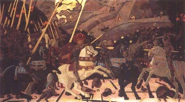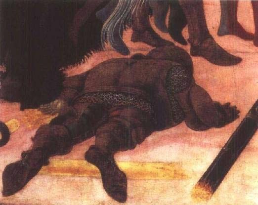 我们可以在另一位佛罗伦萨画家保罗·乌切涪(Paolo Uccello, 1397-1475)的作品中研究那些问题的魅力和难处,他的作品保存得最完好的一幅在伦敦国立美术馆(National Gallery),是一个战争场面(图166)。这幅画当初可能打算放在梅迪奇宫(Palazzo Medici)的一个房间的护壁板上(覆盖墙壁下部的镶板),梅迪奇宫是佛罗伦萨最有权势、最富有的一个商人家族的城市邸宅。它画的是当时仍属时论题材的佛罗伦萨的一个历史事件,即1432年圣罗马诺(San Romano)的溃败:那是当时意大利各集团频繁内战中的一次战斗,佛罗伦萨军队打败了他们的敌人。表面上看来,这幅画可能显得中世纪的味道十足。这些全副甲胄的骑士们手执沉重的长矛,骑着马仿佛去参加校场比武,这可能使我们想起中世纪骑士的传奇故事。表现手法乍一看也不觉得很现代化。画中的马和人看起来都有些像木偶,近似玩具,而且整个欢乐的画面显得跟实际战斗迥然不同。但是,如果我们问一下自己,为什么这些马匹看起来有点像摇木马,为什么这整个场面隐隐约约使我们联想起木偶戏,我们就会有意外的发现。这恰恰是因为画家十分迷恋于他的技艺所具有的新效果,不遗余力地让他的人物突出在空间之中,仿佛是刻出来的,而不是画出来的。据说透视法的发现给予乌切洛的印象十分深刻,使得他日日夜夜地画透视缩短的物体,不断地给自己出新题目。他的画友经常说他是那样全神贯注于研究之中,竟致他的妻子叫他睡觉时,他都难得抬头,而且还要惊叹:“透视法多么美妙啊!”我们在画中就可以看到流露出迷恋透视法的一切迹象。乌切洛显然痛下苦功,用正确的短缩法描绘散落在地面上的各种各样的甲胄。他最得意的可能就是从马上跌倒在地上的那个武士的形象,武士的短缩画法一定是极为困难的(图167)。以前从来没有画过这样的形象,而且,尽管跟其他人物相比显得稍微小了一点,我们还是不难想到它一定引起了巨大的轰动。画面上到处都能发现一些迹象,表现出乌切洛对透视法的兴趣和透视法支配他心神的那股魅力。甚至连地上的断矛都布置得朝向它们共同的“消失点”。这个似乎在进行战斗的舞台,之所以有人工造作的样子,有一部分就应归因于这一整齐的数学布局。如果我们从这一骑士古装表演回顾凡·艾克的骑士图(见238页,图157)和我们曾经跟它进行过比较的林堡弟兄的细密画(见219页,图144),或许可以比较清楚地看出乌切洛得益于哥特式传统之处,以及他怎样进行了改变。北方的凡·艾克根据观察增添了越来越多的细节,试图把物体的外表描摹得惟妙惟肖到最细微的色调,从而改变了国际式风格的形貌。而乌切洛则选择了相对的路线:通过他所热爱的透视技艺,试图构成一个真实的舞台,使他的人物在那个舞台上有立体感、有真实感。当然,它们有立体感是毫无疑问的,但是其效果却跟人们通过透视镜看到的立体画有些相似。乌切洛还没有学会怎样使用光线、明暗和大气来修润严格的透视画法的刺目的轮廓。但是,如果我们站在国立美术馆中的原画面前,就不会感觉哪里有不恰当的地方,因为,尽管乌切洛全神贯注于应用几何学,但他毕竟是一位真正的艺术家。