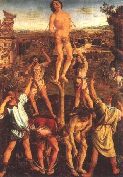 事实上,这种布局非常清楚、非常对称,几乎过于生硬了。画家显然意识到这个毛病,试图采取一些变化。一个刽子手弯下腰调整他的弓,是正面的形象,对应的一个人则表现为背面的样子;射箭的人物也是这样。画家用这个简单的方法努力调剂构图的生硬的对称性,并造成一种运动和反运动的感觉,很像在一段音乐中的进行和反进行。在波拉尤洛的画中,这种方法用得还有些不自然,而且他的构图看起来有些像技巧练习。我们可以设想他画对应的人物形象是使用同一个模特儿而从不同的侧面去观看,而且我们感觉他以熟悉人体的肌肉和动作为荣,这几乎使他忘记了这幅画的真正主题是什么。此外,在他要着手解决的问题上,也很难说波拉尤洛已完全成功。他的确运用透视法的新技艺画出了背景中的一段奇妙的托斯卡纳风光远景,然而中心主题跟背景实际上互不调和。前景中圣徒殉难的小山丘没有道路通向后面的景致。人们几乎要纳闷,如果波拉尤洛把他的构图放到浅淡或金色之类背景中是不是要更好一些。但是人们很快就明白他无法采纳那种设计;这样生动、这样真实的形象放到金色的背景中看起来就会不得其所。一旦艺术走上了跟自然竞争这条路,就绝不会回头。对于波拉尤洛的画所表现的这类问题,15世纪的艺术家一定在画室中做过讨论;而意大利艺术在后一代到达了顶峰也正是由于找到了解决这个问题的方法。