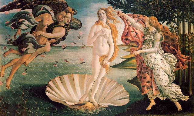 15世纪后半叶致力解决这个问题的佛罗伦萨艺术家中,有一位画家叫山德罗·波蒂切利(Sandro Botticelli, 1446-1510)。在他最著名的画中,有一幅画的不是基督教传说,而是古典神话《维纳斯诞生》(The Birth of Venus)(图172)。在整个中世纪里,古典诗人并没有被人忘却,然而直到“文艺复兴”时期,意大利人那样热情地试图重新恢复罗马昔日的光荣时,古典神话才在有文化的普通人民中间传播开来。在那些人看来,备受赞扬的希腊人和罗马人的神话所表现的并不仅仅是快活而有趣的童话故事;他们非常信服古人的高超智慧,以致相信那些古典的传说之中必定包含着一些深邃、神秘的真理。委托波蒂切利为其乡村别墅作画的那个赞助人是富强的梅迪奇家族的一个成员。或是赞助者本人,或是他的一位博学的朋友,大概已经向画家讲解过他所知道的古人对维纳斯从海中出现的描绘。在这些学者看来,维纳斯出世的故事是神秘的象征,通过它,神对美的启示才传到人间。人们不难想像画家是毕恭毕敬地着手创作,用相称的方式去表现这个神话。画面描绘的活动很快就能看懂。维纳斯站在贝壳上从海中出现,在玫瑰花飘落之中,风神们飞翔着把贝壳推向岸边。在维纳斯就要举步登陆的时候,一位季节女神或水中仙女(Nymph)拿着紫红色斗篷迎接她。在波拉尤洛失败之处,波蒂切利获得了成功;他的画确实形成一个完美和谐的图案。然而波拉尤洛可能会说,波蒂切利是牺牲了一些他当初下了那么大苦功要保留下来的成就,才取得这一效果的。波蒂切利的人物看起来立体感不那么强,画得不像波拉尤洛或马萨乔的人物那么准确。他的构图中的优雅动作和具有韵律的线条使人想起吉伯尔蒂和安杰利科修士的哥特式传统,甚至可能是14世纪的艺术——例如西莫内·马丁尼的《圣母领报》(见213页,图141)或者法国金匠的作品(见210页,图139)之类,人物的体态轻柔袅娜,衣饰精巧飘落。波蒂切利的维纳斯是那么美丽,以致我们忽略了她脖子的长度不合理,她的双肩是直削而下,还有她的左臂跟躯干的连接方式也很奇特。或者更恰当一点,我们应该这样说,波蒂切利为了达到轮廓线优美而更改了自然形象,增强了设计上的美丽与和谐,因为这加强了她的感染力,更加使人感到这是一个无限娇柔、优美的人物,是从天国飘送到我们海边的一件礼物。