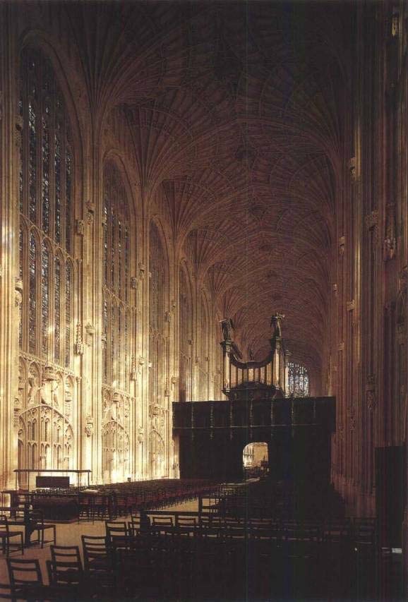 特别是在英国,我们能够看出在哥特式风格的最后阶段就有那样一些倾向在发挥作用,那个阶段叫做垂直式风格(Perpendicular)。这个名称是用来表示14世纪晚期和15世纪的英国建筑特点,因为在那些建筑物的装饰物上,直线要比以往“盛饰式”花饰窗格中的曲线和弧线更为常见。垂直式风格的最著名的建筑就是剑桥国王学院(King's College)的奇妙的礼拜堂(图175),于1446年动工兴建。这座教堂的内部形状比先前那些哥特式内部要简单得多——没有侧廊,也就没有立柱和尖峭的拱。整个建筑给人的印象是一座高高矗立的大厅,而不是一座中世纪的教堂。这样,虽然整体结构比巨大的主教堂要简朴,可能也要世俗些,但是哥特式工匠们的创造力却得到自由,能在细部中尽情发挥;特别是在拱顶的形式(“扇形拱顶”[fanvault])方面,它的曲线和直线的奇特花边使人回想起在克尔特人和诺森伯兰人的写本中出现的非凡的奇观(见161页,图103)。