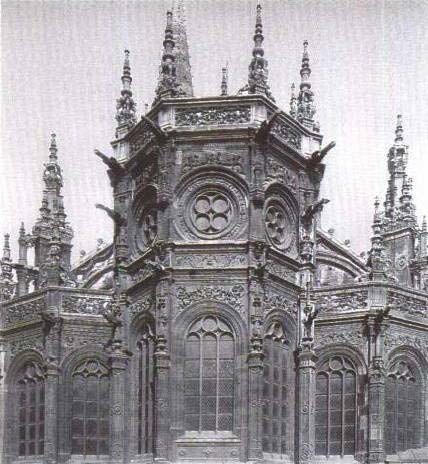 一个令人神往的奇观是去观察各种各样的艺术家和艺术传统在那种新学术的冲击下做出的反应,看一看他们是怎样地肯定自己,而有时他们又是怎样地低首屈服——反应的差异取决于他们性格的强弱和眼界的广狭。建筑家的处境大概最为困难。他们所习惯的哥特式传统和古代建筑的复兴。二者至少在理论上都完全符合逻辑,并不自相矛盾,但是在目标和精神方面彼此的差异之大却无以复加。所以经过很长的一段时间,阿尔卑斯山以北才在建筑中采用了新式样。他们采用新式样时,往往都是由于那些访问过意大利而且想赶上时代的君主和贵族们坚决要求而不得不从命。即使在这种情况下,建筑家也常常是按照新风格的要求在表面上敷衍一下。他们为了显示一下自己熟悉新观念,就在这里放上一根圆柱,那里放上一条饰带——换句话说,是给他们那丰富的装饰母题再添加一些古典的形式,多数情况是,建筑物的主体部分完全不变。法国、英国和德国有那么一些教堂,要么其中支撑拱顶的支柱已附加了柱头,因而表面上变成圆柱;要么其中的哥特式窗户满布花饰窗格,但是窗户的尖拱已经让步,改成圆拱(图218)。有一些老式的修道院却用古怪的瓶形圆柱支撑着;有一些满布塔楼和扶垛的城堡却用古典的细部做装饰;有一些带山墙的城镇住宅上还出现了一些饰带和胸像(图219)。一个认为古典规则尽善尽美的意大利艺术家,大概会对那些东西大为惊诧,掉头而去。但是,如果我们不用任何迂腐的学究标准去衡量它们,那幺我们就常常会赞赏他们的聪敏和才智,竟把那些互不一致的风格调和在一起。