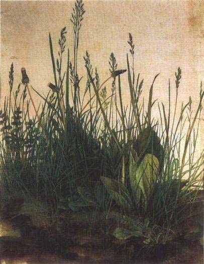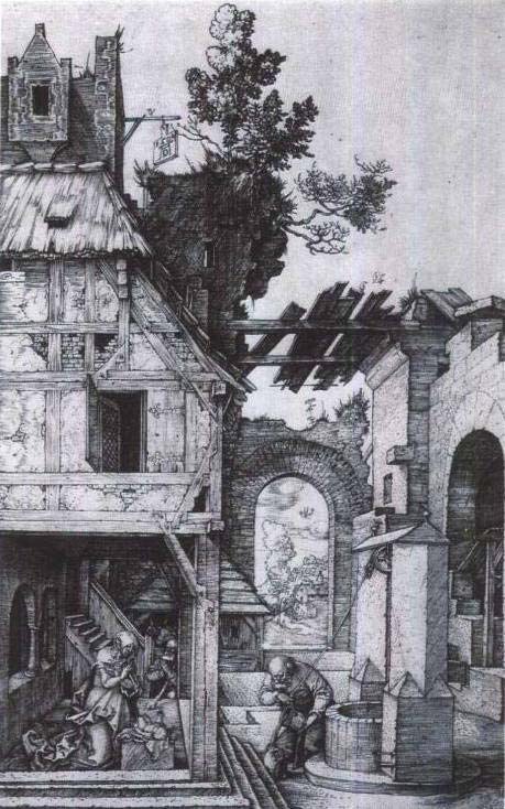 但是,虽然丢勒已经证明自己是一位富于奇思玄想的名家,是以前建造巨大教堂门廊的哥特式艺术家的真正继承人,可是他并没有止步停息,为这一成就而踌躇满志。他的习作和速写说明他还力求认真地注视自然之美,力求像杨·凡·艾克以来的任何一位艺术家那样耐心而忠实地予以摹拟,因为正是杨·凡·艾克曾经表明,北方艺术家的任务就是像镜子一样地反映自然。丢勒的那些习作中有一些已经非常著名,例如他画的野兔(见24页,图9),或者他描绘一片草地的水彩习作(图221)。看来丢勒虽然努力掌握描摹自然的熟练技能,但与其说那本身是他要达到的目标,还不如说那是作为一条较好的途径,以便呈现出他要用绘画、雕版和木刻去图示的宗教故事中的真实可信的景象。他画出那些速写所凭仗的那种耐心,同样也使他成为天生的版画家,他总是不厌其烦地在细部上再添加细部,在他的铜版上构成一个真实的小世界。他的《耶稣诞生图》(图222)作于1504年(那大约就是米开朗琪罗以他的人体知识震惊了佛罗伦萨的时候),丢勒在画中描绘了舍恩高尔(见284页,图185)已经在他的可爱的雕版画中表现过的主题。那位前辈艺术家已在那幅画中带着特殊的爱描绘过破旧牲口房的断壁颓垣。乍一看,这似乎就是丢勒的主要题材。一个古老的农家院落,灰浆破裂,砖块松散;一面破裂的墙壁,还有树木从裂缝那里生长出来;摇摇欲坠的木板代替屋顶,鸟儿在上面建了巢;这个院落被设想、被描绘得那样平静深沉,饱含耐心,人们能够感觉到艺术家是多么欣赏这个富于画趣的古老建筑的构思。相比之下,人物形象的确显得很小,几乎无关紧要:玛利亚把那旧牲口房当作庇身之处,正跪在她的圣婴前面,而约瑟正忙着从井里打出水来,小心地倒入一个细长的水罐之中。人们必须仔细地观看才能发现背景中有一个正在礼拜的牧人,而且几乎要用放大镜才能发现空中照例有一个天使在向人间宣布这个愉快的消息。然而没有人会郑重其事地说丢勒不过是想显示他描绘古老的断壁颓垣的技能而已。这座废置不用的农家旧院和卑微来客,表现出一种田园宁静的气氛,使我们跟画家创作此画时一样以虔诚的心情去沉思那圣夜的奇迹。在这种版画中,丢勒好像已经把哥特式艺术转向摹写自然以来的发展都集中起来,提高到尽善尽美的境界。然而与此同时,他的心灵又忙于为意大利艺术家提出的新艺术目标而奋斗。