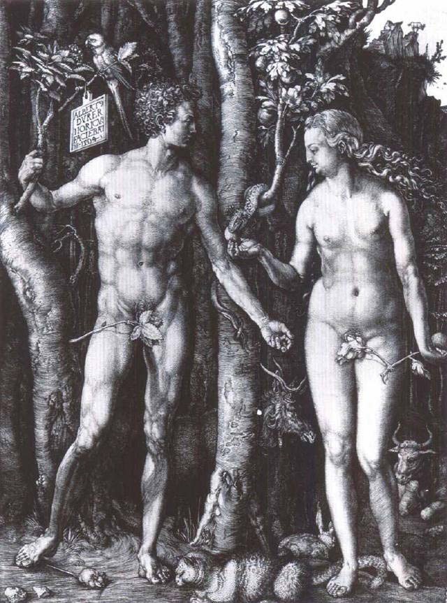 我们要想马上看出这一幅版画中的成就也许并不容易。因为艺术家在使用另一种语言,跟我们前而引以为例的那幅画中所使用的语言相比,他对目前这种语言还不那么熟悉。他辛勤地用圆规和直尺度量和平衡后所取得的和谐形状不像它们的意大利和古典模特儿那么真实而美丽。不仅在形状和姿势上,而且在构图的对称上,也有一些造作的形迹。但是丢勒不像二流艺术家那样,他没有失去自身的本色去崇拜新的偶像,一旦认识到这一点,认为这幅画笨拙的第一感很快就会消失。与他引导着我们进入画中的伊甸园(the Garden of Eden)的时候,那里的老鼠安静地躺在猫的身旁,麋、牛、野兔和鹦鹉也不畏惧人的足音;一旦我们的视线探入到生长着智慧之树的树丛之中,观看那条蛇在给夏娃命运之果,而亚当伸手去接,一旦我们注意到丢勒怎样努力使精心塑造的白皙身体的清晰轮廓,在长有粗糙树木的暗影之中显现出来,我们就会开始赞赏这种把南方的理想移植到北方土壤上的第一次认真的尝试。