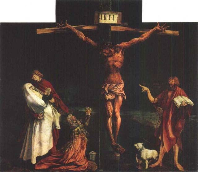 毫无疑问,艺术家想叫观看祭坛的人沉思一番,想一想他以施洗约翰指着救世主的手来特别强调的那几句话,也许他甚至还想叫我们看到基督必定怎样生长而我们怎样萎缩。因为在这幅画中,现实似乎是用它的十足的恐怖描绘出来的,却有一个奇怪的不真实之处:人物形象的大小差别很大。我们只要比较一下在十字架下面的抹大拉的玛丽亚的双手跟基督的双手,对它们的大小悬殊就十分清楚了。在这些地方,格吕内瓦尔德显然反对从文艺复兴发展起来的那种现代艺术规则,他有意重新返回中世纪画家和原始时期画家的原则,他们本是按照人物形象在画面上的重要性来改变它们的大小的。正如他为了祭坛的精神喻义已经牺牲了那种悦目之美一样,他也不顾比例正确的新要求,因为这样做能帮助他表达圣约翰所说的话的神秘玄义。