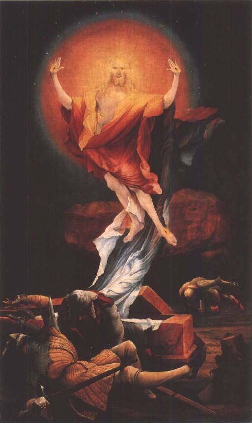 这样,格吕内瓦尔德的作品就能再次提醒我们,一个艺术家确实能够做到既十分伟大又不“先进”,因为艺术的伟大并不在于有新的发现。而每当那些新的发现能帮助格吕内瓦尔德表现出他所要传达的东西时,从他的作品中就能清清楚楚地看到他并不是不熟悉那些新发现。正如他用他的画笔去描绘基督痛苦死去的尸体那样,他也用画笔在另一块嵌板上表现出基督复活时变幻为一片天光的神奇影像(图225)。这幅画难以描述,因为它的效果又是大大依赖于它的色彩。看起来基督仿佛刚刚从墓中飞起,身后拖着一条明亮的光带——那是裹住尸体的寿衣,反射出那光环中的彩色光线。基督飞翔在这场面之上,地面上的士兵被这一突然出现的光辉影像照得眼花缭乱,不知所措,飞升的基督和兵士们无能为力的姿势形成鲜明的对比,兵士们在他们的甲胄之中扭动的方式使我们感觉到了那震惊的强烈程度。我们无法判定前景和背景之间的距离,所以坟墓后面的两个士兵看起来就像刚刚翻倒的木偶,他们的扭曲的形状也仅仅在于使基督变容后的安详而崇高的形象更加鲜明突出而已。