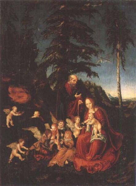 丢勒那一代的第三位著名的德国艺术家是卢卡斯·克拉纳赫(Lucas Cranach, 1472-1553),一开始工作就是一位大有希望的画家。年轻时,他在德国南部和奥地利住了几年。在出身于阿尔卑斯山南麓丘陵地带的乔尔乔内发现了山地景致之美的时候(见328页,图209),这位青年画家正在神往于富有古老森林和浪漫景色的北麓丘陵地带。在1504年,也就是丢勒发表他的版画(图222、图223)那一年,克拉纳赫在一幅画中表现了在逃往埃及的路上的圣家族(图226)。在树木丛生的山区,圣家一门正在一道泉水旁边休息。这是荒野之中的一个迷人的地方,生长着一些表皮粗糙的树木,沿着一个美好的绿色山谷下去是一片广阔的景色。一群群小天使围拢在圣母身边;一个正在给圣婴基督浆果,一个正在用贝壳取水,其他的已经坐下来演奏管笛,让这些疲乏的难民恢复精神。这个富有诗意的构思保留了一些洛赫纳的抒情艺术的精神(见272页,图176)。