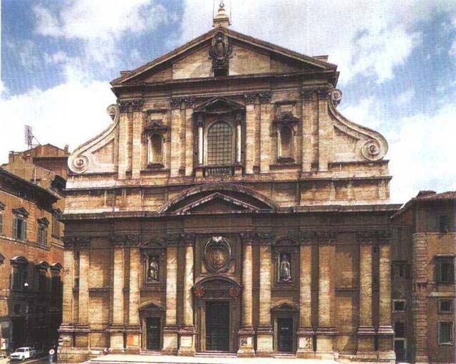 耶稣会教堂(Il Gesu)的立面由著名的建筑家贾科莫·德拉·波尔塔(Giacomo della Porta, 1541?-1604)建成。在我们看来,它也会显得乏味,因为后来许许多多教堂的立面都用它做样板。但是仔细看一看,马上就明白它当年必曾给予人们极为新颖、巧妙的印象,丝毫也不逊于教堂内部。我们立刻看出它由古典建筑要素组成,全部定型部件组合在一起:圆柱(更确切地说,半圆柱和壁柱)负载着“额枋”,额枋顶部冠以高高的“顶楼”,而顶楼又负载着上面一层。连这些定型部件的分布也使用了古典建筑的一些特征:巨大的中央入口用圆柱做框架,两侧辅以较小的入口,使人回想起凯旋门的组合(见119页,图74),这里再说一遍,这个组合跟音乐家心中的大调和弦一样牢固地树立在建筑家心中,在这个单纯、雄伟的立面中,没有任何为了追求矫饰的随想而故意蔑视古典规则的迹象。然而,使古典要素融合为一个图形的方法表明罗马和希腊甚至还有文艺复兴的规则已经被抛弃。这个建筑立面,最惊人的特点是把单根的圆柱或壁柱都改为双根,仿佛使整个建筑结构更富丽、更多变、更庄重。我们看到的第二个特点是,艺术家是那样地苦心经营,以求避免重复和单调,以求各部分能在中央形成高潮,在中央的主要入口并用双重框架给予突出。如果我们返回再看以前用相似的要素组成的建筑物,立刻就看出性质已有巨大的变化。比较之下,布鲁内莱斯基的“帕齐小教堂”(Cappella Pazzi)(见226页,图147)奇妙地单纯,显得无限轻松而优美,而布拉曼特的“小神庙”(Tempietto)(见290页,图187)的清楚、直率的布局便显得近乎质朴。连桑索维诺的复杂盛饰的“威尼斯图书馆”(见326页,图207)在相比之下也显得单纯,因为那里反复使用同一个图形;只要看到它的一部分,也就看到它的全部了。在波尔塔这个第一座耶稣会教堂的建筑立面中,处处都有赖于整体给予它的效果。它全部融合在一起,成为一个巨大而复杂的图形。大概在这一方面最典型的特点是建筑家花费苦心把建筑物的上层和下层连接起来的方式。他使用了一种古典建筑中未曾出现的卷涡纹。我们只要想像一下,就不难体会这种卷涡纹放在希腊神庙或罗马剧场的某个地方看起来该是多么不恰当了。事实上,那些维护纯粹古典传统的人对巴洛克风格的建筑家的许多责难,正是应由那些曲线和旋涡饰负责。但是,如果我们用纸片盖住那些引起责难的装饰物,尝试看一下建筑物中没有它们会是什么样子,我们就不得不承认它们并不仅仅是装饰而已,没有它们,建筑物就要“分崩离析”。它们有助于实现艺术家的意图,给予建筑物必要的聚合性和统一性。随着时间的流逝,巴洛克风格的建筑家不得不使用空前大胆非凡的手段给予大型的图型必要的统一性。孤立地看,那些手段往往令人莫名其妙,但是在所有的优秀建筑物中,它们都是达到建筑家意图的必要手段。