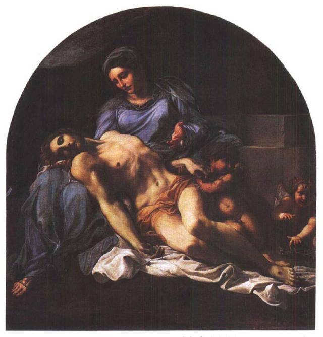 在摆脱了手法主义驻足不前的做法以后,绘画走向了一种比以前大师们的风格具有更丰富前景的风格,这种发展在某些方面跟巴洛克建筑的发展相似。在丁托列托和埃尔·格列柯的伟大作品中,我们已经看到了一些观念正在发展,那些观念在17世纪的艺术中越来越重要,亦即强调光线和色彩,漠视单纯的平衡,偏爱比较复杂的构图;然而17世纪的绘画并不就是手法主义风格的继续。至少那时候的人们不这么认为;他们感到艺术已经走向一条墨守成规的危险道路,必须另辟蹊径。在那个时代,人们喜欢谈论艺术。特别是在罗马,有一些有修养的绅士们乐于讨论当时艺术家中间出现的各种“运动”(movement),喜欢把他们跟较老的艺术家比较,而且参与艺术界的争吵和密谋。对于艺术界来说,这样一些讨论本身就有颇为新颖之处。这种讨论始于16世纪,开始是讨论这么一些问题,例如绘画与雕刻孰优孰劣,或者设计与色彩孰重孰轻(佛罗伦萨人重设计,威尼斯人则重色彩)。到了17世纪,他们的话题就不同了,转而讨论当时的两位艺术家,那两位艺术家从意大利北部来到罗马,他们觉得其方法完全不同。一位是来自波洛尼亚(Bologna)的安尼巴莱·卡拉奇(Annibale Carracci, 1560-1609),另一位是来自米兰附近一个小地方的米凯兰杰洛·达·卡拉瓦乔(Michelangelo da Caravaggio, 1573-1610)。这两位艺术家好像都厌烦手法主义,但是他们克服手法主义的矫饰之处的方式却大不相同。安尼巴莱·卡拉奇出身于研究威尼斯艺术和科雷乔艺术的画家家庭。他到达罗马以后,便对拉斐尔的作品入了迷,对它们大为赞赏。他立志学习那些作品中的某些单纯和美丽之处,而不是像手法主义者那样故意反其道而行之。后来的批评家们说他有意模仿以前所有的伟大画家的长处。其实,他未必就曾设计出那样一种绘画方案(即所谓“折衷主义”方法)。那种作画方案是后来拿他的作品当作样板的学院或艺术学校设计出来的。卡拉奇本人是一位真正的艺术家,接受不了那样一种愚蠢的观念。但是在罗马派系之中,他那一派的战斗口号却是培育古典美。在祭坛画《圣母哀悼基督》(图251)中,我们能够看出他的意图。我们只要回想一下格吕内瓦尔德画的饱受痛苦折磨的基督的身体,就能理解安尼巴莱·卡拉奇是怎样煞费苦心地不让我们想到死亡的恐怖和痛苦的折磨。画面本身就像一个初期文艺复兴画家安排得那样单纯而和谐。然而我们不大会把它错认为一幅文艺复兴时期的作品。画中的光线照射在救世主身体上的方式,对我们的感情的全部感染力,都和以前的作品完全不同,这是巴洛克式风格。人们很容易把这样一幅画斥为情调感伤,但是我们绝对不能忘记作画的意图。这是一幅祭坛画,打算在它前面点上蜡烛供祈祷和礼拜者注目反省的。