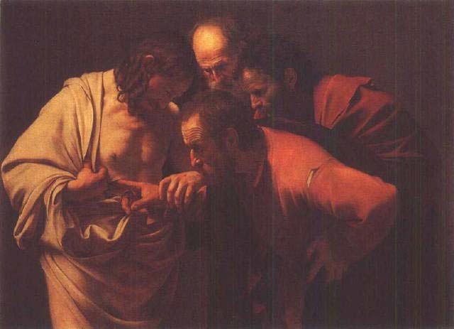 卡拉瓦乔不管我们认为美不美都要忠实地描摹自然,这种“自然主义”态度比卡拉奇强调美的态度更为虔诚。卡拉瓦乔一定反复阅读过圣经,深入思考过它的字句。他是像以前的乔托和丢勒那样伟大的艺术家,打算像观看正在邻居家里发生的事情一样,亲眼目睹那些神圣事件。他尽最大的努力去使古老的经文中的人物看起来更加真实、更加可感可触,连他掌握明暗的方法也有助于达到这个目的。他的光线并不使身体看起来优美而柔和:光线晃眼,几乎刺目,跟深深的阴影形成对比。然而他使用的光线却是那样执拗而忠实地把整个奇异的场面突现出来,其忠实在当时的人们中很少有人能够赏识,然而对后来的艺术家却有决定性的影响。
