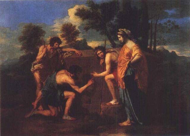 最伟大的“学院派”大师是法国人尼古拉·普桑(Nicolas Poussin, 1594-1665),他以罗马作为第二故乡。普桑满怀热情地研究古典雕像,因为他想以古典雕像的美来帮助他表达他心目中的纯朴而高贵的昔日乐土的景象。图254是他持续进行的研究所取得的最著名的成果之一。它展现的是阳光明媚的南方宁静风景。一些漂亮的青年男子跟一个美丽、高贵的少女围拢在一个巨大的石墓周围。他们是牧民,因为我们看到他们戴有花环,拿着牧杖。一位牧民已经跪下来试图去辨认墓碑上的刻辞,另外一位牧民指着刻辞看着那位美丽的牧羊女,牧羊女跟她对面的同伴一样,安静而忧郁地站在那里。刻辞是拉丁文,写着ET IN ARCADIA EGO(甚至阿卡迪亚亦有我在),意思是:我,死神,连阿卡迪亚这个牧歌中的梦幻之乡也在我的统治之下。我们现在就明白站在两边凝视着坟墓的两个人物为什么是那么一副畏惧和沉思的奇妙姿态,而我们更为赞赏的是阅读刻辞的两个人物动作之间的相互呼应之美。布局似乎相当简单,但那简单是来自渊博的艺术知识。只有这样的知识才能唤起这一恬静、安谧的怀旧景象,死亡在这里已经丧失了恐怖感。