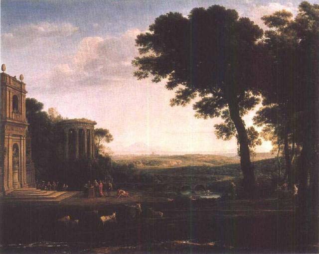 正是同样的怀旧之美,使另一位意大利化的法国人的作品享有盛名。他是克劳德·洛兰(Claude Lorrain, 1600-1682),大约比普桑小6岁。洛兰研究了罗马附近的坎帕尼亚(Campagna)的风景,那是罗马周围的平原和山丘,具有可爱的南方色彩,还有一些雄伟的古迹引人缅怀伟大的往昔。跟普桑一样,洛兰的速写表明他是如实表现自然的高手,他的树木习作给人极大的乐趣。但是在精致的油画和蚀刻画中,他仅仅选择他认为跟往昔梦幻美景中的场所相称的母题,而且他把景色全部浸染上金色光线或银色空气,似乎就使整个场面理想化了(图255)。正是克劳德首先打开了人们的眼界,使人们看到自然的崇高之美。在他身后几乎有一个世纪之久,旅行者习惯于按照他的标准去评价现实世界中的景色。如果那个地方使他们联想起洛兰的景象,他们就认为那个地方美丽,坐下来野餐。一些富有的英国人甚至进而决定把称为己有的那一块自然景色,即他们地产上的园林,仿照克劳德的美丽的梦境加以改造。就这样,许许多多大片的英国美丽的乡村实际上应该加上这位定居在意大利、奉行卡拉奇方案的法国画家的签名。