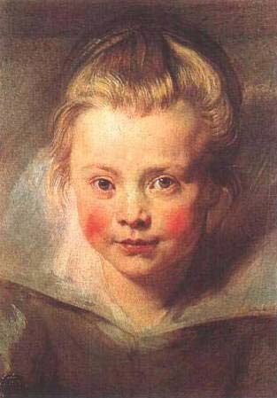 1608年鲁本斯回到安特卫普时31岁,该学的东西都学到手了;在掌握画笔和色彩方面,在表现人体和农饰、甲胄和珠宝、动物和风景等方面,他都是那么纯熟,在阿尔卑斯山以北独步一时。他的佛兰德斯前辈们通常是画小幅画。他在意大利养成的嗜好是以巨大的画幅去装饰教堂和宫殿,这正适合上层教会人士和君主的趣味。他已经学会在大面积的画幅上布置人物以及使用光线与色彩去加强总体效果的技术。图256是为安特卫普一座教堂的主祭坛上的一幅画而准备的速写,显示出鲁本斯对意大利前辈们研究得多么精深,发展他们的观念有多么大胆。这又是圣徒们环绕着圣母那久负盛名的古老主题,在威尔顿双连画(见216-217页,图143)、贝利尼的“圣母”(见327页,图208)或者提香的“佩萨罗的圣母”(见330页,图210)等作品的创作年代,艺术家已经为这个主题费过心血。为了看出鲁本斯多么自由而轻松地处理这项古老的任务,再翻出前面那些插图看一看还是有意义的。一看就清楚,跟以前那些画相比,鲁本斯这幅画有更多的动作,更多的光线,更大的空间,以及更多的人物。一群兴高采烈的圣徒们正在向圣母高踞的宝座涌去,在前景中有主教圣奥古斯丁(St Augustine)、殉教者圣劳伦斯(St Laurence)(手里拿着他曾在上面受刑的炮烙架)和托伦提诺(Tolentino)的修道士圣尼古拉斯(St Nicholas),他们把看画者一直引向他们礼拜的对象。圣乔治带着龙,圣塞巴斯提安带着箭筒和箭,满怀激情地互相对视,一个武士手拿殉难的棕榈叶,就要在宝座前下跪。那一组妇女中有一个是修女,她们正在欣喜若狂地仰望中心场面,在那里一位年轻姑娘由一个小天使扶助,正在跪下去接受那小圣婴的一个指环,圣婴在母亲膝上向她弯下身来。那是圣凯瑟琳订婚的传说,她在幻景中看到了这样的场面,认为自己就是基督的新娘。圣约瑟从宝座后面仁慈地看着,圣彼得和圣保罗二人,一个可以由钥匙辨认出来,一个可以由佩剑辨认出来,正站在那里沉思。他们跟另一边圣约翰的高大形象形成鲜明有力的对比,圣约翰独自站在那里,全身浸沐着光线,欣喜地举臂赞美,两个可爱的小天使正向宝座的台阶上拖他那不愿意走的羔羊。另一对小天使从天上冲下来要把一顶桂冠放到圣母的头上。看完局部,我们必须再一次端详整个画面,欣赏那股大气磅礴的动势,鲁本斯用这动势竟然把所有的人物都结合在一起,给予整个画面一种欢乐的、节日的隆重气氛。能够以这样准确的手眼设计这样巨大画面的画家,自然很快就有许多订做绘画的生意,以致一个人应付不了。然而这并没有难住他。鲁本斯有巨大组织能力和巨大魅力,许多有天资的佛兰德斯画家都以能在他的指导下工作、从而跟他学习为荣。如果订做一幅新画的要求来自某个教堂,或者来自欧洲的某个国王或君主,他有时会只画一幅着色的小速写(图256就是为一幅大型构图所画的一幅着色速写),由他的学生和助手把那些想法摹绘到巨大的画布上。只有在他们按照他的想法涂出底色、着上色彩以后,他才可能再拿起画笔在这里修润一个面孔,在那里修润一件绸衣,或者把对比过于生硬之处修润得柔和一些。他自信他的笔法转瞬就能赋予任何东西以生命,事实也确实如此。这正是鲁本斯的最大的艺术奥秘——他的魔法般的技巧能使所有的东西栩栩如生,热情而欢快地活起来。在他遣兴而作的某些简单的素描(见16页,图1)和绘画中,我们能够很好地评价和欣赏这种技艺。图257是一个小姑娘的头像,可能是鲁本斯的女儿。这里根本没有构图的诀窍,没有华服盛装和缕缕光线,只有一个孩子的简单的en face(迎面)肖像。然而她似乎在呼吸,心也在跳动,好像活人一样。跟这幅画一比,前几个世纪的肖像不知怎么会看起来冷淡而不真实——不管它们可能是多么伟大的艺术品。试图分析鲁本斯怎样赋予画面欢快的生命力是枉费心机的,但是那必然跟大胆、精细地处理光线有一定关系,他用光表示出嘴唇的湿润、面部和头发的造型。他比前辈提香更多地使用画笔作为主要工具。他的绘画不再是使用色彩仔细塑造的素描,它们使用“绘画性的”(painterly)手段做出,这加强了有生命和活力的感觉。