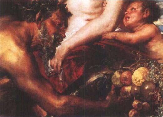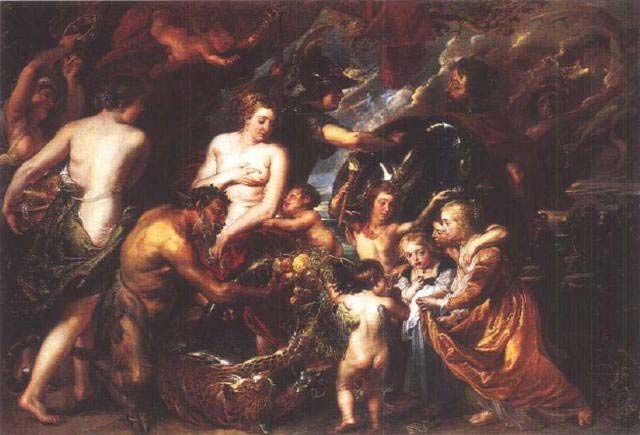 他在安排色彩缤纷的大型画面和在赋予画面以充沛的活力方面都有无与伦比的天赋,这些天赋相互结合使鲁本斯获得了以前的画家望尘莫及的声誉和成功。他的艺术是那么出色地适合为宫殿增添豪华和壮丽,为人间的权势人物增光生色,所以在他的领域内仿佛据有垄断者的地位。当时欧洲的宗教和社会的紧张局势达到危急关头,欧洲大陆处在可怕的三十年战争中,英国处在内战中。一边是专制君主和他们的宫廷,大都得到天主教的支持;另一边是新兴的商业城市,大都是新教徒。尼德兰自身就分裂为抗拒西班牙“天主教”控制的新教的荷兰和由忠于西班牙的安特卫普市统治的天主教的佛兰德斯。鲁本斯作为天主教阵营的画家登上了他的独一无二的高位。他接受的业务来自安特卫普的耶稣会会士和佛兰德斯的天主教统治者,来自法国国王路易十三和他狡诈的母亲玛丽亚·德·梅迪奇(Maria de' Medici),来自西班牙国王菲力普三世和英国国王查理一世,他们授予他爵士称号。当他作为贵宾从一个宫廷去到另一个宫廷时,他经常带有微妙的政治和外交使命,其中最重要的,就是为了我们今天称为“保守”同盟的利益,在英国和西班牙之间进行调停。同时他仍然跟当时的学者们保持接触,进行拉丁文的学术通讯,讨论关于考古和艺术的问题。他带着贵族佩剑的自画像(图258)表明他完全意识到他的独一无二的地位。可是在他的敏锐的目光中,却丝毫没有自大虚浮的地方;他仍然是个真正的艺术家。那些技艺眩人眼目的画作,一直在从他的安特卫普的画室中大量倾泻出来。他创作的古典寓言画和寓意画,跟他自己女儿的那幅画像一样栩栩如生,令人叹服。寓意画通常被人认为相当枯燥而抽象,但在鲁本斯那个时代却成为表达思想观念的便利手段。图259就是这样一幅画,据说鲁本斯是把它作为礼物带给查理一世的,当时他正试图劝说他跟西班牙媾和。这幅画对比了和平的赐福和战争的恐怖。密涅瓦(Minerva)这位司智慧和才艺的女神在驱逐战神玛尔斯(Mars),玛尔斯正要退却——他的可怕的同伴复仇女神(Fury)已经转身而去。在密涅瓦的保护之下,和平的快乐在我们跟前展现开来,这些象征丰饶富足的标志只有鲁本斯能够想像出来,和平之神(Peace)正要给一个孩子喂奶,一个农牧神快乐地注视着那些美好的水果(图260),还有巴克科斯(Bacchus)的其他同伴,即带着金银财宝跳舞的两个女祭司(maenad),和那只像大猫一样正在平静地玩耍的豹;另一边有三个孩子不安地瞪着眼睛从战争的恐怖之下逃到和平与富足的庇护之地,一位幼小的守护神给他们带上花冠。凡是一心沉浸在过幅画的丰富细部、生动对比和鲜艳色彩之中的人,都能看出这些观念对于鲁本斯来讲已不是软弱无力的抽象事物,而是生动的现实事物。大概就是因为这个特点,有些人必须首先对他的作品习惯起来,才能开始热爱和理解他的作品。他不喜欢古典美的“理想”形式;对他来说,它们太生疏、太抽象。他所画的男男女女是他眼见心爱的那一类活生生的人。这样,由于他那时代在佛兰德斯并不流行苗条身材,于是今天就有一些人不喜欢他画中的“肥胖女人”。这种批评自然跟艺术没有多大关系,所以我们就不必认真对待。不过,由于经常有人提出这种批评,所以有必要认识到鲁本斯对于活泼而近乎喧闹的生活的形形色色的表现都深有所喜,使他不致成为纯粹卖弄精湛技术的艺匠。这就使他的绘画从娱乐处所的巴洛克装饰品一变而为艺术杰作,甚至在博物馆里的冷飕飕的气氛中仍然保持着它们的生命力。