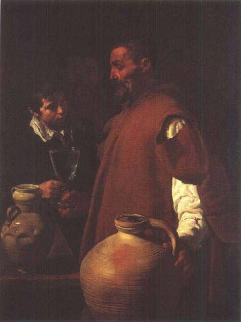 在去西班牙的一次旅途中,鲁本斯遇见了一位青年画家,这位青年画家跟鲁本斯的学生凡·代克生于同一年,在马德里的菲力普四世国王宫廷中占有一席位置,跟凡·代克在查理一世宫廷的情况相似。他是迭戈·委拉斯开兹(Diego Velazquez, 1599-1660)。虽然委拉斯开兹当时还没有去过意大利,但是他通过模仿者的作品知道了卡拉瓦乔的发现和手法,留下了很深的印象。他已经吸收了“自然主义”的方案,用他的艺术表现他对自然的冷静观察,无视那些陈规旧例。图263是他的早期作品之一,画的是一位老人正在塞维利亚(Seville)的街道上卖水。这幅画属于尼德兰人为显示技巧而开创的风俗画类型,但是它的画法却具有卡拉瓦乔的“圣多马”(图252)的全部强烈性和观察力。老人满布皱纹的憔悴面容和褴褛的衣衫,圆形的大陶壶,带釉的水罐的表面,在透明的玻璃杯上闪动的光线,这一切画得那样令人信服,我们觉得不妨用手摸一摸。站在这幅画前面,谁也不想问一问它画的这些事物美不美,也不想问一问它画的场面重要不重要。甚至连色彩本身也并不全美,画面以棕色、灰色、微绿的色调为主。然而整体联结在一起却是那么瑰丽和谐,只要在它前面稍作停留,这幅画就留在记忆中难以忘怀。