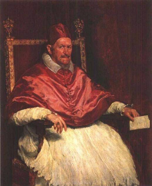 委拉斯开兹听从了鲁本斯的劝告,求得宫廷准许到罗马去研究大师们的绘画。他在1630年到达罗马,但是不久就返回马德里。除了后来又去了一次意大利以外,他一直留在马德里,是菲力普四世宫廷的一个著名的受尊敬的成员。他的主要任务是给国王和王室成品画肖像。那些人很少有漂亮的面目,连有趣的面孔也很少。他们是一帮自命高贵的男女,服饰僵硬,不合身。对于一个画家,给这样一些人画肖像似乎不是诱人的工作。但是委拉斯开兹仿佛使用魔法,把那些肖像一变而为人间所曾见过的最迷人的绘画杰作。他早就不再亦步亦趋地追随卡拉瓦乔的手法了。他已经研究过鲁本斯和提香的笔法,但是他描绘自然的方式却丝毫不是“转手货”。图264是委拉斯开兹的《教皇英诺森特十世(Innocent X)肖像》,1650年画于罗马,晚于提香的《保罗三世像》(见335页,图214)一百多年;它使我们想起在艺术史上时间的推移不一定总要引起观点的改变。委拉斯开兹必定感觉到那幅杰作的挑战,跟提香当年曾被拉斐尔画的群像(见322页,图206)所激励的情况非常相似。但是,尽管他掌握了提香的手段,即用画笔描绘物质光泽的方式和捕捉教皇表情的准确用笔,我们仍然坚信这就是被画者本人,而不是一个熟练的公式。去罗马的人都不应该错失机会,不能不去多里亚·潘菲利宫(Palazzo Doria Pamphili)体验一下目睹这幅杰作的非凡感受。实际上,委拉斯开兹的成熟作品高度地依靠笔法的效果和色彩的微妙的和谐,插图仅仅能使人对原作的面貌略有印象而已。他有一幅巨型绘画(大约10英尺高),名为Las Meninas(《宫女》)(图266),大抵也有上述特点,我们在画中看到委拉斯开兹本人正在画一幅大型绘画,如果我们细看一下,还能发现他正在画什么。画室后墙上的镜子反射出国王和王后的形象(图265),他们正坐在那里让画家为他们画像。由此我们就看到他们所看见的场面——一群人进了画室。那是他们的小女儿玛格丽塔(Margarita)公主,两侧各有一个宫女,一个正在给她茶点,另一个则向国王夫妇屈膝行礼。我们知道她们的姓名,我们也知道那两个矮子的情况(那个丑陋的女子和那个逗狗的男孩),他们是养活着供开心取乐的。背景中的严肃的成年人好像是在查明这帮参观者的举动是否规矩。