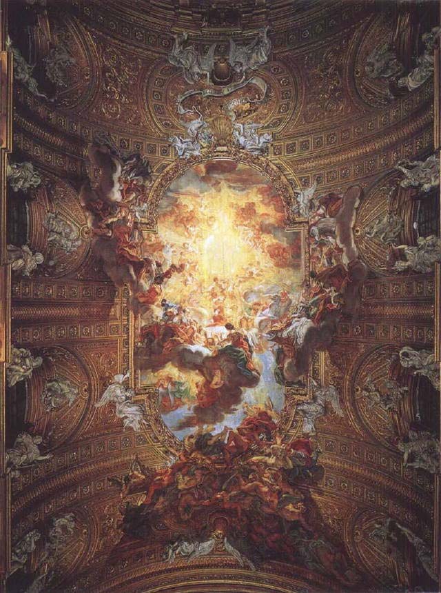 如果像贝尔尼尼的“圣特雷莎”那样的雕刻作品的确只能在它们原定的环境之中进行评价,那么对于巴洛克式教堂中的绘画装饰品来说,情况就更是如此。图287是罗马的耶稣会教堂的天花板装饰,出于追随贝尔尼尼的画家乔瓦尼·巴蒂斯塔·高里(Giovanni Battista Gaulli, 1639-1709)之手。这位艺术家想给我们一种教堂的拱顶已经打开的感觉,一种让我们直接看到天堂荣耀的幻觉。以前科雷乔有把天空画在天花板上的念头(见338页,图217)。但是高里的效果不可比拟地更为舞台化。主题是“耶稣圣名的崇拜”(the Holy Name of Jesus),圣名用放光的字母刻在教堂的中央,四周围着无数有翼小童(cherub)、天使和圣徒,个个狂喜地凝视着那光线,而一群群恶魔或者堕落的天使被整批赶出天界,表现出了绝望的样子。拥挤的场面似乎要冲破天花板的边框,天花板上到处都是云彩,载着圣徒和罪人直奔教堂而来。艺术家想使我们在画面冲破边框的情况下茫茫然而不知所措,结果我们就再也分辨不出哪儿是现实,哪儿是错觉了。像这样一幅画离开它原定的所在以后就毫无意义。所以,在巴洛克风格充分发展起来以后,所有艺术家都通力合作,去达到某种效果,而作为独立艺术的绘画和雕刻在意大利和欧洲整个天主教地区就衰微了,大概这完全不是偶然的巧合。