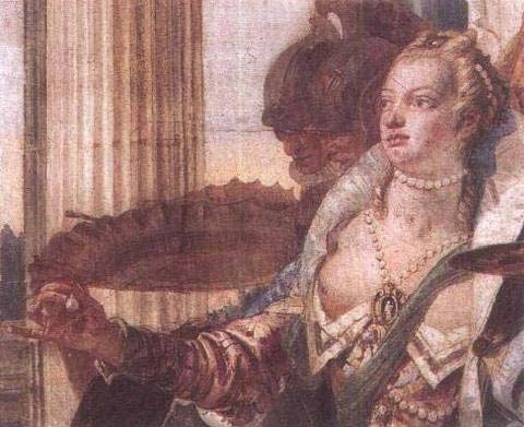 在18世纪,意大利的艺术家主要是一些卓越的内部装饰家,他们的灰泥装饰技术和伟大的湿壁画驰名全欧,能把一座城堡或一座修道院的任何大厅粉饰为盛典嘉会的场所。其中最著名的有—位是威尼斯的乔瓦尼·巴蒂斯塔·提埃坡罗(Giovanni Battista Tiepolo, 1696-1770),他不仅在意大利工作,还在德国和西班牙工作。图288是他给一座威尼斯宫殿所做的装饰的一部分,大约画于1750年,它表现的题材是款待克娄巴特拉(Cleopatra)的宴会,这个题材给丁提埃坡罗各种机会去显示鲜艳的色彩和豪华的服装。传说马克·安东尼(Mark Antony)设宴招待埃及女王,宴会一定要ne plus ultra(无比)豪华。最名贵的菜一道道接连而上,无止无休。女王却无动于衷。她跟骄傲的主人打赌,说她要做一道菜,比他已经摆上来的菜要珍贵得多;她从耳环上摘下一颗著名的珍珠,溶解在醋中,然后喝掉这饮料。在提埃坡罗的湿壁画上,我们看到她给马克·安东尼看珍珠,而一位黑仆则拿给她一个玻璃杯。