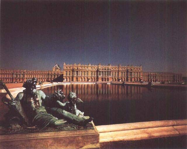 不仅仅是罗马教会发现了艺术有感染和征服人心的威力。17世纪欧洲的国王和君主同样急于显示他们的强权,从而加强他们对人心的控制。他们也想作为一种不同凡俗的人出现,根据神授王权的观念高踞于普通人之上。17世纪后半期最强大的统治者法国的路易十四表现尤其突出,他在政策中处心积虑地利用王权的夸示和显赫。路易十四邀请洛伦佐·贝尔尼尼到巴黎去帮忙设计他的王宫,这绝不是偶然的事情。那个宏伟的规划并没有实现,但是路易十四的另一座王官却成为他的巨大权力的真正象征。那就是凡尔赛宫(Palace of Versailles),大约建于1660年到1680年(图291)。凡尔赛宫非常巨大,照片难以使人对它的外观有正确的认识。它的每一层都至少有123个窗户,朝向花园。花园本身有修剪整齐的林荫道、石瓮和雕像(图292),连同台地和池塘,向乡下延伸达数英里。