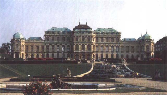 只是到了下一代,建筑家们才完全吸收了这个经验教训,因为巴洛克风格的罗马教堂和法国城堡已激发了当时的想像力。在德国南部,每一个小君主都想拥有一所他自己的凡尔赛宫;在奥地利和西班牙,每一座小修道院都想跟博罗米尼和贝尔尼尼的感人至深的壮丽设计争奇斗胜。1700年前后那一段时期是最伟大的建筑时代之一;而且还不单单是建筑的伟大时代。当时的城堡和教堂不是简单地设计成建筑物而已,而是要求所有艺术部门都做出贡献,以便建成一个异想天开的人造世界。整座整座的城镇仿佛都被用做舞台布景,大片大片的田园被改造成花园,溪流则改造成小瀑布。艺术家得到充分自由去尽情地设计,把他们的最出人意表的想像用石头和金色的灰泥去化为现实。往往在他们的计划还未成为现实时,金钱就已经花光了;但是爆发了那一阵奢侈的创造热潮以后,结果促进了欧洲天主教地区许多城镇和风景的面貌的改观。特别是在奥地利、波希米亚和德国南部,意大利和法国的巴洛克风格的观念融合成为最大胆、最一致的风格。图293是奥地利建筑家卢卡斯·冯·希尔德布兰特(Lucas von Hildebrandt, 1668-1745)在维也纳为马尔波罗(Marlborough)的盟友萨瓦(Savoy)王侯欧根(Eugene)建造的城堡。这座城堡矗立在一座山上,好像轻盈地翱翔于一个有喷泉和矮树篱的梯形花园之上。希尔德布兰特把它明确地组合成7个不同的部分,使人联想到花园中的亭台;有5个窗户的中央部分向前突出,两边辅以2个略矮的翼部,而这个组合又在两侧辅以较矮的部分和4个构成整个建筑边框的塔楼式的角亭。中央的楼台和两边的角亭是装饰最富丽的部分,建筑物形成一个复杂的图形,然而轮廓仍然十分清楚、明晰。就连希尔德布兰特用来装饰细部的奇特的怪诞装饰,那向下渐细的半柱、窗户上断续的旋涡式弧形檐饰和沿屋顶排列的雕像与战利品装饰,也完全没有破坏建筑物的清晰性。