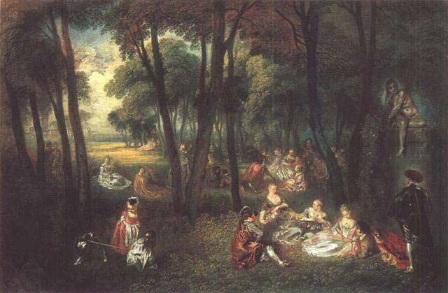 人们可以理解,阿尔卑斯山以北地区的情况也绝对不逊于意大利,每一种艺术形式都被卷入这一放纵的装饰活动之中,大大地丧失了它们独自的重要性。当然在1700年前后那一段时期也不是没有知名的画家和雕刻家,然而大概只有一位名家的艺术可以跟17世纪前半期的伟大的绘画名家相比。那位名家是安托万·华托(Anloine Watteau, 1684-1721)。华托生在比利时,但是定居在巴黎,37岁那年在巴黎故去。他也为贵族的城堡设计内部装饰品,为上流社会的节庆和盛会设置合适的环境。但是实际生活中的喜庆活动仿佛没有使这位艺术家的想像力得到满足。他开始画自己想像中的摆脱了苦难和琐事的生活景象,那是一种梦境般的美好生活,在从来也不下雨的神话花园里快乐地野餐,那是淑女个个美丽、情郎个个优雅的音乐集会,在那样一个社会里,人人都穿着光彩闪烁的绫罗绸缎,然而却不显得浮华,男女牧民的生活好像是一连串的小步舞。从这样的描述中,人们可能得到一个印象,以为华托的艺术过分精美而不自然。许多人认为华托的艺术已经开始反映18世纪初期法国贵族的趣味即罗可可(Rococo)风格:那是一种喜欢优美的色彩和精巧的装饰的时尚,它代替了巴洛克时期较为刚健的趣味,表现出一种快乐的轻浮。但是华托是个远为伟大的艺术家,不可能就是他那个时代时尚的代表而已。可以说他以他的美梦和理想助长了我们所谓的罗可可时尚的形成。正如凡·代克曾经帮助产生了联想到王党成员的那种绅士派头的潇洒观念(见405页,图262),华托也用他的优美风流的景象丰富了我们的想像宝库。