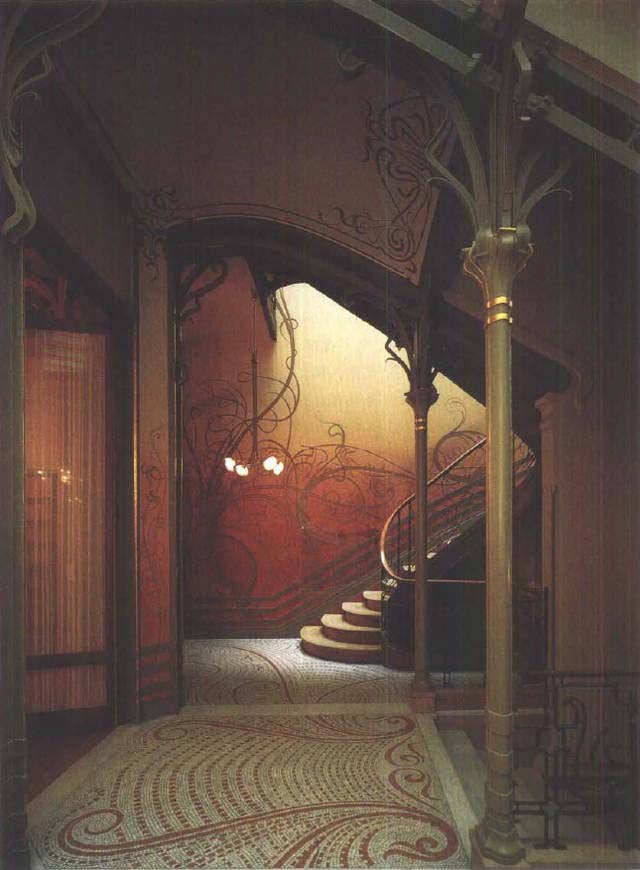 拉斯金和莫里斯本来还指望通过恢复中世纪的创作条件使艺术获得新生。但是许多艺术家看到那是不可能的。他们渴望以一种新感受对待设计和各种材料自身所具有的潜力,去创造一种“新艺术”。于是在19世纪90年代举起了这面新艺术即Art Nouveau的旗帜。建筑家开始采用新型材料和新型装饰进行建筑实验。如前所述,希腊柱式本是从原始的木头结构发展而来(见77页),从文艺复兴时期以后建筑装饰业一直用做开业的家当(见224页250页);然而现在,当一种使用铁和玻璃的新建筑已经不知不觉地悄然出现在火车站和工业建筑中时(见520页),难道不正是这种新建筑演化出它自身装饰风格的大好时机吗?如果西方建筑过于墨守旧的建筑法成规,那么东方能不能提供一套新样式和新观念呢?